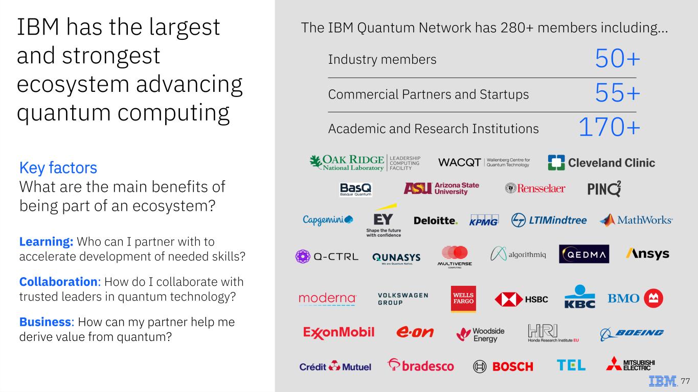 IBM has the largest and strongest ecosystem advancing quantum computing Key factors What are the main benefits of being part of an ecosystem? Learning: Who can I partner with to accelerate development of needed skills? Collaboration: How do I collaborate with trusted leaders in quantum technology? Business: How can my partner help me derive value from quantum? The IBM Quantum Network has 280+ members including… 77 Industry members 50+ Commercial Partners and Startups 55+ Academic and Research Institutions 170+