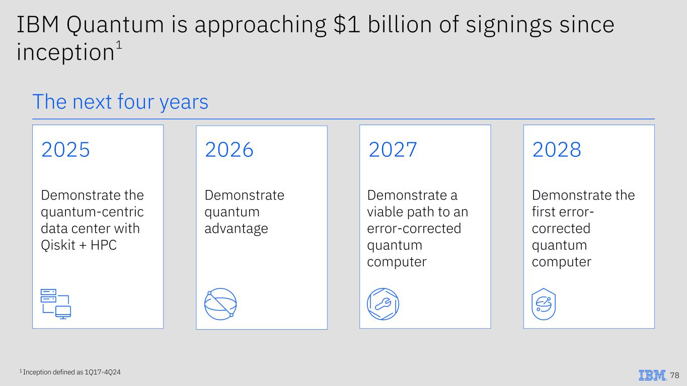 IBM Quantum is approaching $1 billion of signings since inception1 2025 Demonstrate the quantum-centric data center with Qiskit + HPC 2026 Demonstrate quantum advantage 2027 Demonstrate a viable path to an error-corrected quantum computer 2028 Demonstrate the first error- corrected quantum computer 78 The next four years 1 Inception defined as 1Q17-4Q24