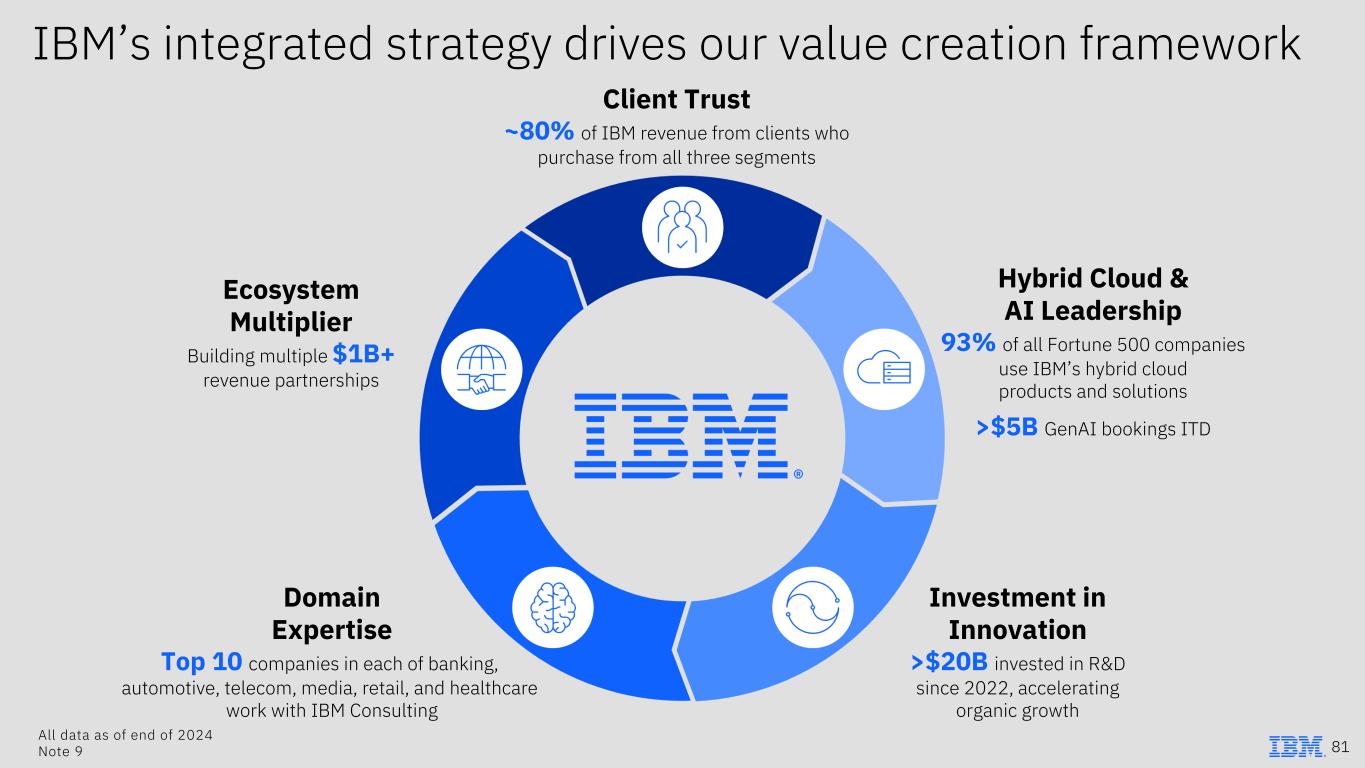 IBM’s integrated strategy drives our value creation framework Client Trust ~80% of IBM revenue from clients who purchase from all three segments Hybrid Cloud & AI Leadership 93% of all Fortune 500 companies use IBM’s hybrid cloud products and solutions >$5B GenAI bookings ITD Domain Expertise Top 10 companies in each of banking, automotive, telecom, media, retail, and healthcare work with IBM Consulting Investment in Innovation >$20B invested in R&D since 2022, accelerating organic growth Ecosystem Multiplier Building multiple $1B+ revenue partnerships All data as of end of 2024 Note 9 81