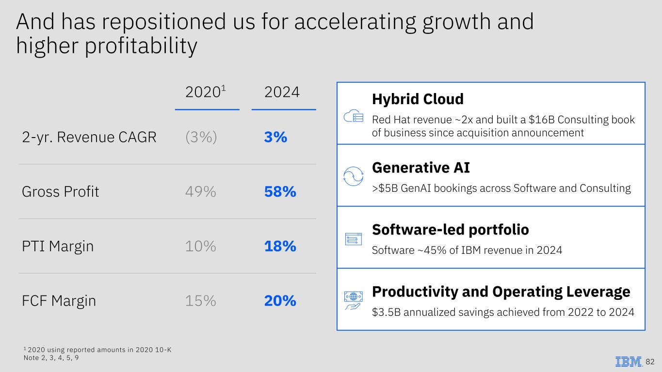 ​Hybrid Cloud Red Hat revenue ~2x and built a $16B Consulting book of business since acquisition announcement Generative AI >$5B GenAI bookings across Software and Consulting Software-led portfolio Software ~45% of IBM revenue in 2024 Productivity and Operating Leverage $3.5B annualized savings achieved from 2022 to 2024 And has repositioned us for accelerating growth and higher profitability 20201 2024 2-yr. Revenue CAGR (3%) 3% Gross Profit 49% 58% PTI Margin 10% 18% FCF Margin 15% 20% 1 2020 using reported amounts in 2020 10-K Note 2, 3, 4, 5, 9 82