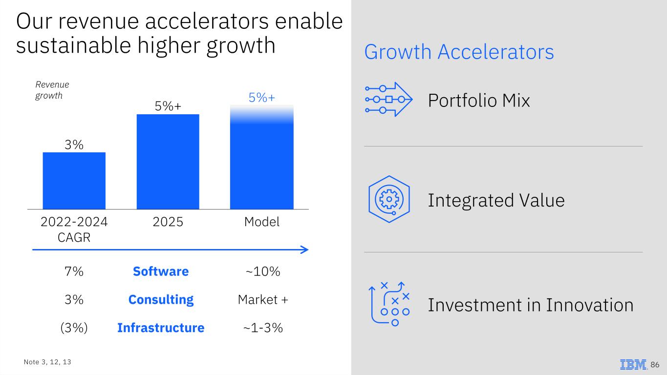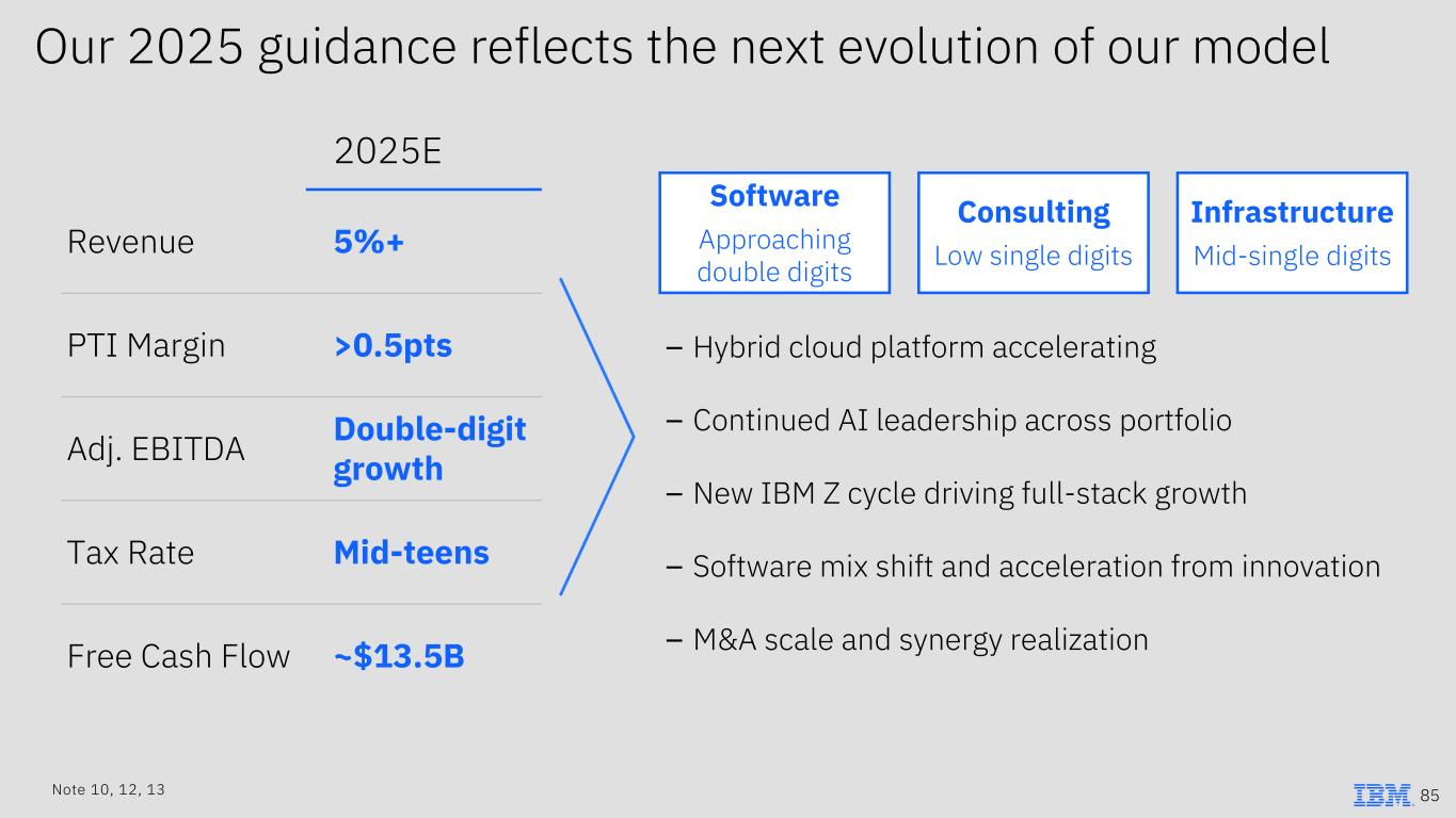 Our 2025 guidance reflects the next evolution of our model 2025E Revenue 5%+ PTI Margin >0.5pts Adj. EBITDA Double-digit growth Tax Rate Mid-teens Free Cash Flow ~$13.5B – Hybrid cloud platform accelerating – Continued AI leadership across portfolio – New IBM Z cycle driving full-stack growth – Software mix shift and acceleration from innovation – M&A scale and synergy realization Software Approaching double digits Infrastructure Mid-single digits Consulting Low single digits Note 10, 12, 13 85