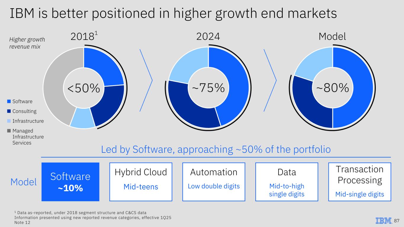 IBM is better positioned in higher growth end markets Higher growth revenue mix Transaction Processing Mid-single digits Software ~10% Hybrid Cloud Mid-teens Automation Low double digits Data Mid-to-high single digits Led by Software, approaching ~50% of the portfolio 20181 2024 Model Model 1 Data as-reported, under 2018 segment structure and C&CS data Information presented using new reported revenue categories, effective 1Q25 Note 12 87