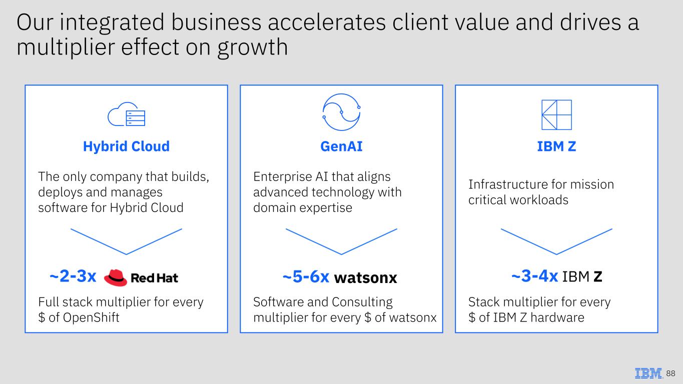 Our integrated business accelerates client value and drives a multiplier effect on growth Hybrid Cloud GenAI IBM Z The only company that builds, deploys and manages software for Hybrid Cloud Enterprise AI that aligns advanced technology with domain expertise Infrastructure for mission critical workloads Full stack multiplier for every $ of OpenShift Software and Consulting multiplier for every $ of watsonx Stack multiplier for every $ of IBM Z hardware ~2-3x ~5-6x ~3-4x IBM Zwatsonx 88