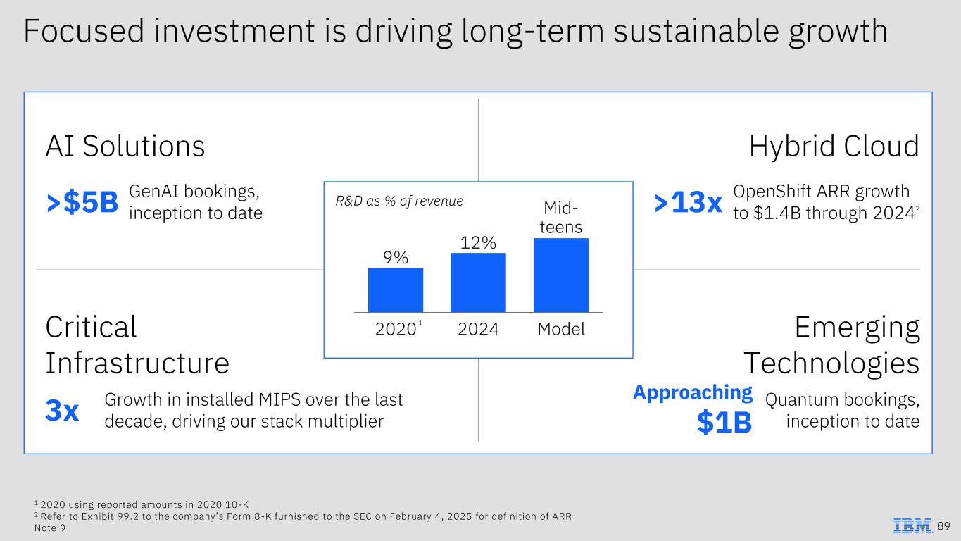 Focused investment is driving long-term sustainable growth GenAI bookings, inception to date>$5B AI Solutions OpenShift ARR growth to $1.4B through 20242>13x Hybrid Cloud Growth in installed MIPS over the last decade, driving our stack multiplier3x Critical Infrastructure Quantum bookings, inception to date Approaching $1B Emerging Technologies R&D as % of revenue 1 2020 using reported amounts in 2020 10-K 2 Refer to Exhibit 99.2 to the company’s Form 8-K furnished to the SEC on February 4, 2025 for definition of ARR Note 9 89 1