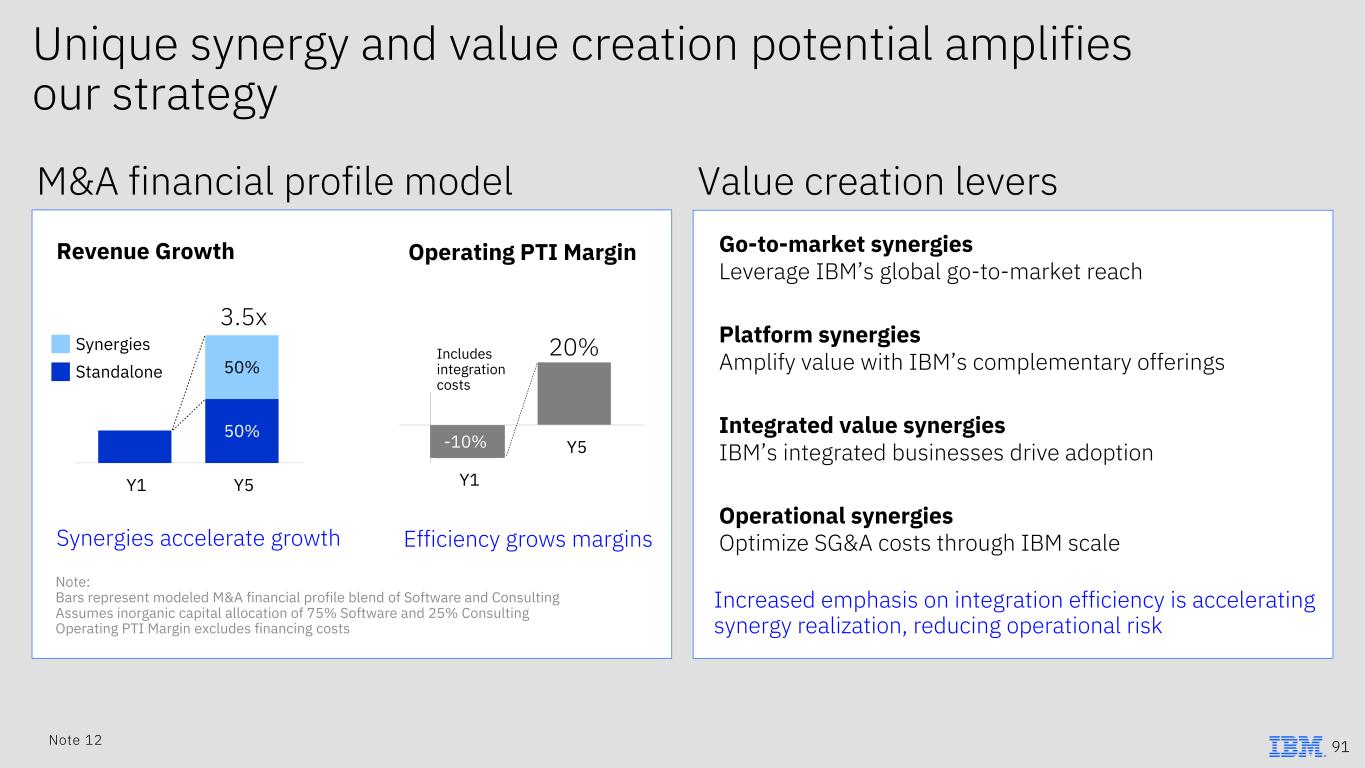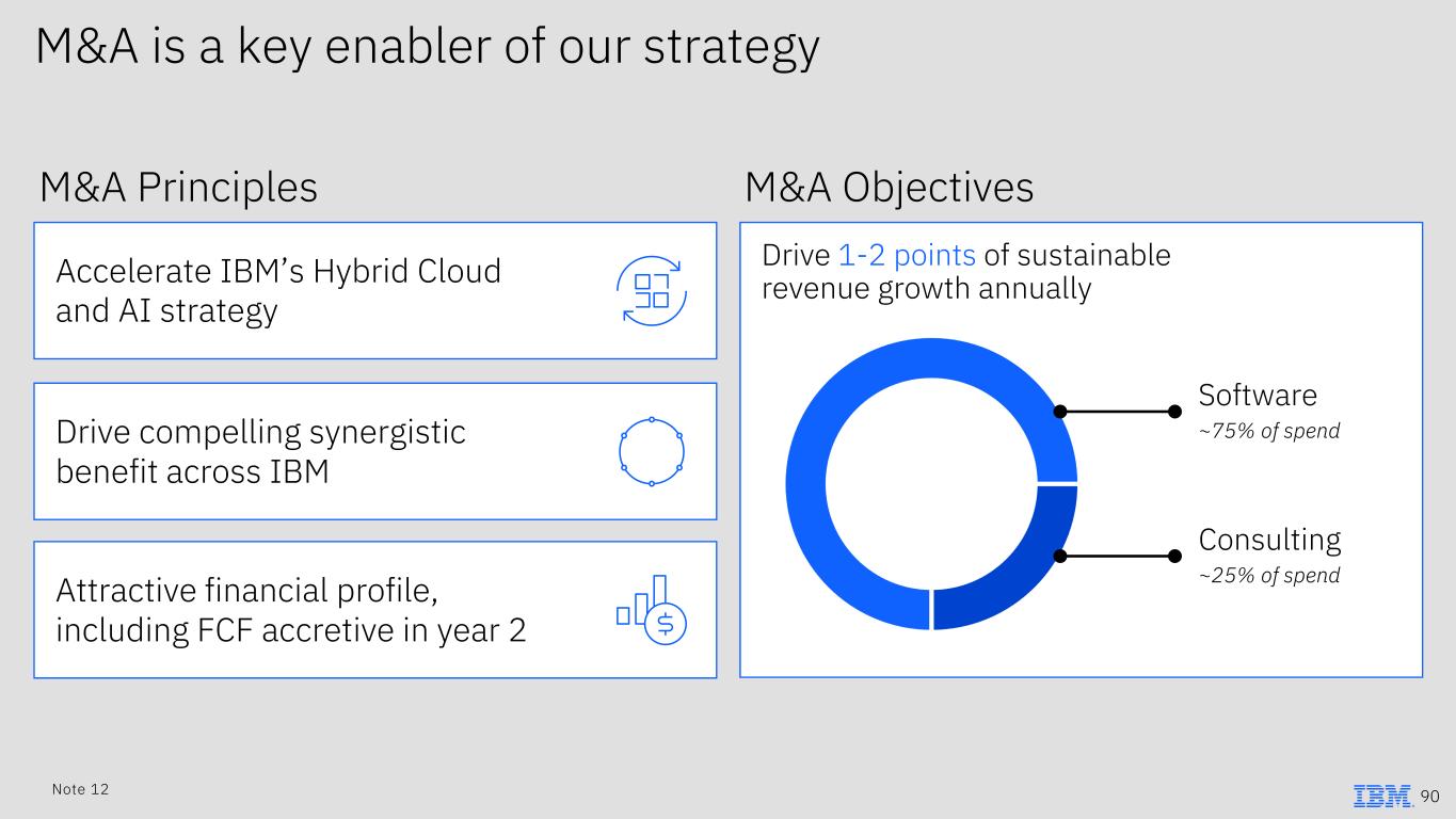 M&A ObjectivesM&A Principles M&A is a key enabler of our strategy Attractive financial profile, including FCF accretive in year 2 Drive compelling synergistic benefit across IBM Accelerate IBM’s Hybrid Cloud and AI strategy Drive 1-2 points of sustainable revenue growth annually Software ~75% of spend Consulting ~25% of spend 90Note 12