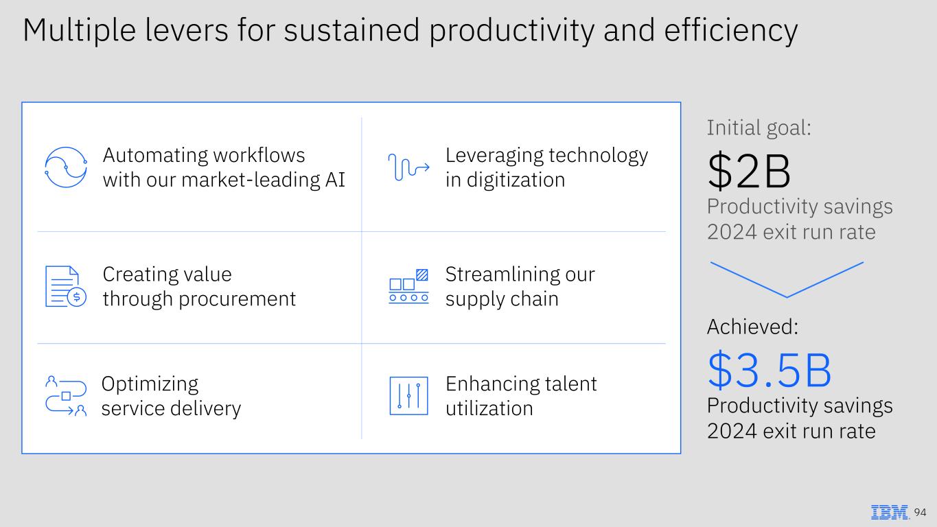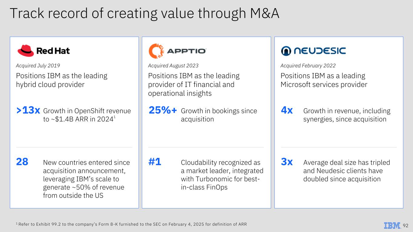 Track record of creating value through M&A Acquired July 2019 Positions IBM as the leading hybrid cloud provider Growth in OpenShift revenue to ~$1.4B ARR in 20241 Growth in bookings since acquisition Growth in revenue, including synergies, since acquisition >13x 25%+ 4x 3x#128 Acquired August 2023 Positions IBM as the leading provider of IT financial and operational insights Acquired February 2022 Positions IBM as a leading Microsoft services provider New countries entered since acquisition announcement, leveraging IBM’s scale to generate ~50% of revenue from outside the US Cloudability recognized as a market leader, integrated with Turbonomic for best- in-class FinOps Average deal size has tripled and Neudesic clients have doubled since acquisition 92 1 Refer to Exhibit 99.2 to the company’s Form 8-K furnished to the SEC on February 4, 2025 for definition of ARR