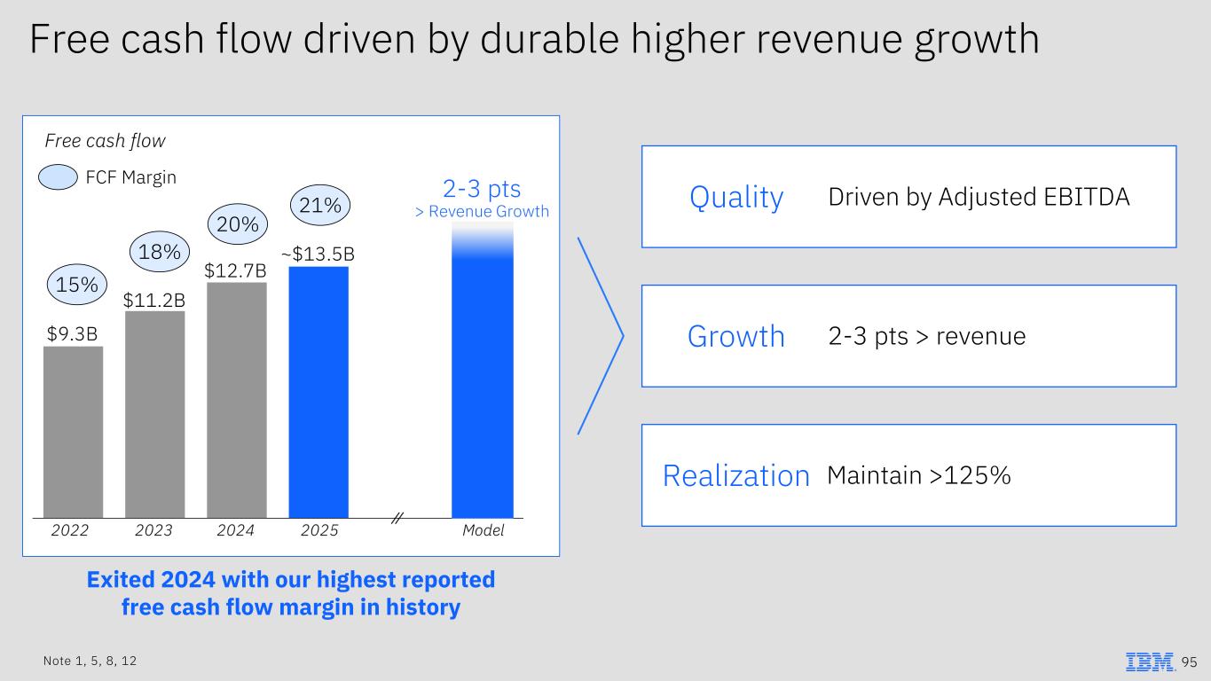 Free cash flow driven by durable higher revenue growth Quality Driven by Adjusted EBITDA Growth 2-3 pts > revenue Realization Maintain >125% 95 FCF Margin 15% 18% 20% 21% Exited 2024 with our highest reported free cash flow margin in history Note 1, 5, 8, 12