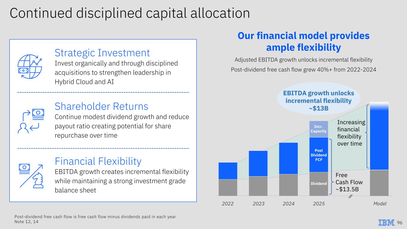 Continued disciplined capital allocation Our financial model provides ample flexibility Adjusted EBITDA growth unlocks incremental flexibility Post-dividend free cash flow grew 40%+ from 2022-2024 Strategic Investment Invest organically and through disciplined acquisitions to strengthen leadership in Hybrid Cloud and AI Financial Flexibility EBITDA growth creates incremental flexibility while maintaining a strong investment grade balance sheet Shareholder Returns Continue modest dividend growth and reduce payout ratio creating potential for share repurchase over time 96 Post-dividend free cash flow is free cash flow minus dividends paid in each year Note 12, 14