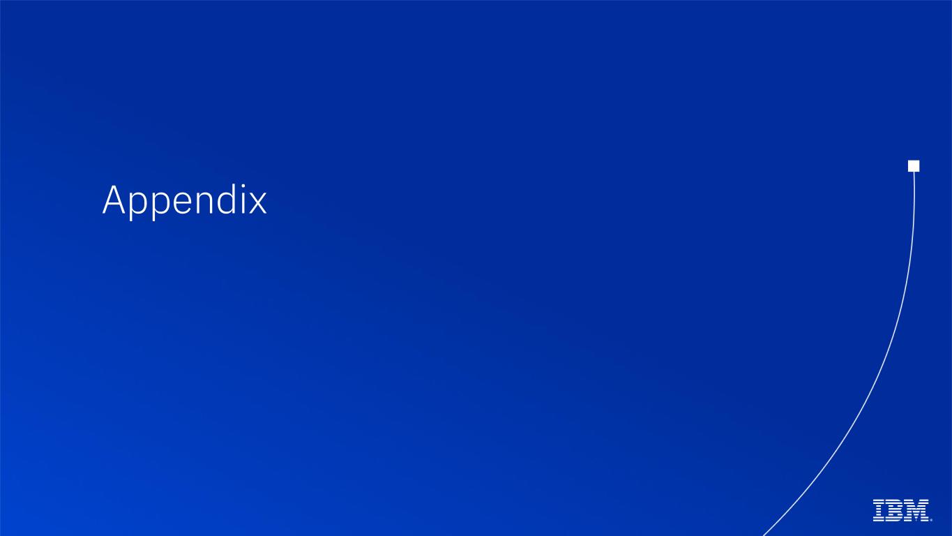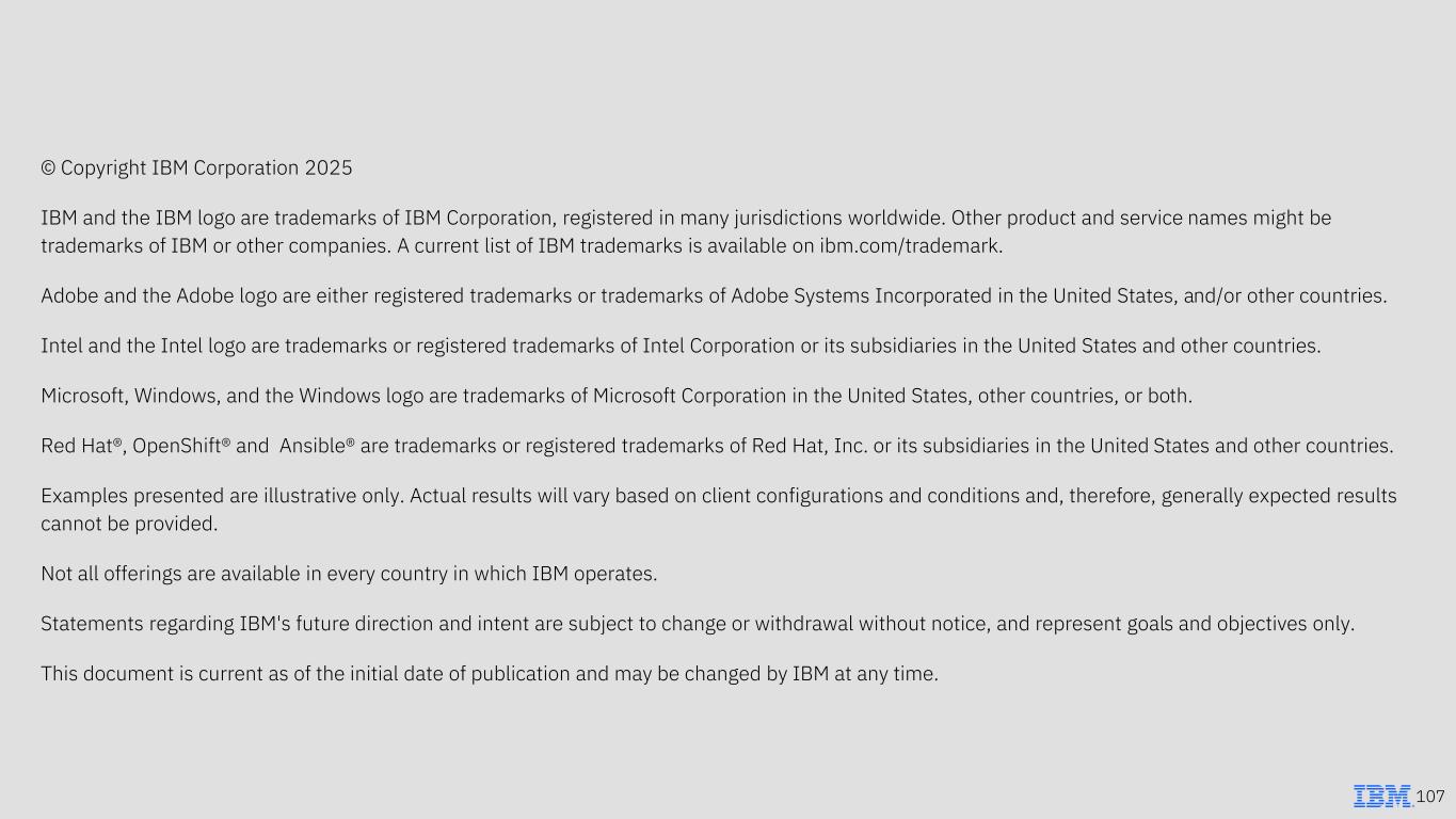 107 © Copyright IBM Corporation 2025 IBM and the IBM logo are trademarks of IBM Corporation, registered in many jurisdictions worldwide. Other product and service names might be trademarks of IBM or other companies. A current list of IBM trademarks is available on ibm.com/trademark. Adobe and the Adobe logo are either registered trademarks or trademarks of Adobe Systems Incorporated in the United States, and/or other countries. Intel and the Intel logo are trademarks or registered trademarks of Intel Corporation or its subsidiaries in the United States and other countries. Microsoft, Windows, and the Windows logo are trademarks of Microsoft Corporation in the United States, other countries, or both. Red Hat®, OpenShift® and Ansible® are trademarks or registered trademarks of Red Hat, Inc. or its subsidiaries in the United States and other countries. Examples presented are illustrative only. Actual results will vary based on client configurations and conditions and, therefore, generally expected results cannot be provided. Not all offerings are available in every country in which IBM operates. Statements regarding IBM's future direction and intent are subject to change or withdrawal without notice, and represent goals and objectives only. This document is current as of the initial date of publication and may be changed by IBM at any time.