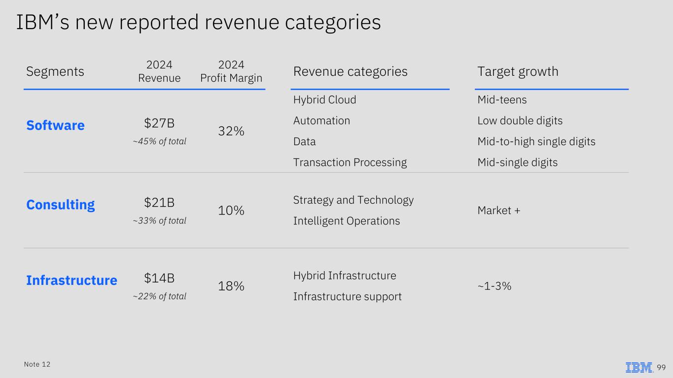 IBM’s new reported revenue categories Segments 2024 Revenue 2024 Profit Margin Revenue categories Target growth Software $27B ~45% of total 32% Hybrid Cloud Automation Data Transaction Processing Mid-teens Low double digits Mid-to-high single digits Mid-single digits Consulting $21B ~33% of total 10% Strategy and Technology Intelligent Operations Market + Infrastructure $14B ~22% of total 18% Hybrid Infrastructure Infrastructure support ~1-3% 99Note 12