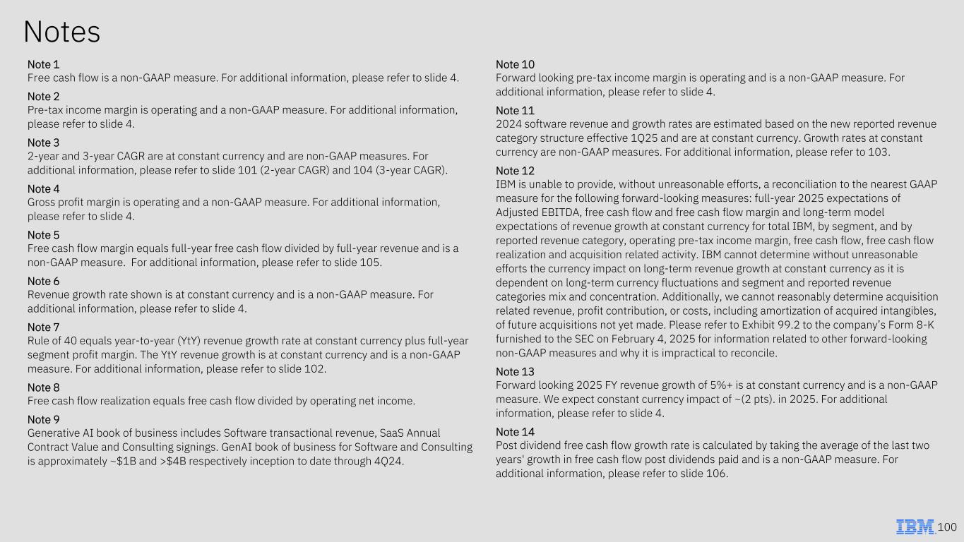 Notes 100 Note 1 Free cash flow is a non-GAAP measure. For additional information, please refer to slide 4. Note 2 Pre-tax income margin is operating and a non-GAAP measure. For additional information, please refer to slide 4. Note 3 2-year and 3-year CAGR are at constant currency and are non-GAAP measures. For additional information, please refer to slide 101 (2-year CAGR) and 104 (3-year CAGR). Note 4 Gross profit margin is operating and a non-GAAP measure. For additional information, please refer to slide 4. Note 5 Free cash flow margin equals full-year free cash flow divided by full-year revenue and is a non-GAAP measure. For additional information, please refer to slide 105. Note 6 Revenue growth rate shown is at constant currency and is a non-GAAP measure. For additional information, please refer to slide 4. Note 7 Rule of 40 equals year-to-year (YtY) revenue growth rate at constant currency plus full-year segment profit margin. The YtY revenue growth is at constant currency and is a non-GAAP measure. For additional information, please refer to slide 102. Note 8 Free cash flow realization equals free cash flow divided by operating net income. Note 9 Generative AI book of business includes Software transactional revenue, SaaS Annual Contract Value and Consulting signings. GenAI book of business for Software and Consulting is approximately ~$1B and >$4B respectively inception to date through 4Q24. Note 10 Forward looking pre-tax income margin is operating and is a non-GAAP measure. For additional information, please refer to slide 4. Note 11 2024 software revenue and growth rates are estimated based on the new reported revenue category structure effective 1Q25 and are at constant currency. Growth rates at constant currency are non-GAAP measures. For additional information, please refer to 103. Note 12 IBM is unable to provide, without unreasonable efforts, a reconciliation to the nearest GAAP measure for the following forward-looking measures: full-year 2025 expectations of Adjusted EBITDA, free cash flow and free cash flow margin and long-term model expectations of revenue growth at constant currency for total IBM, by segment, and by reported revenue category, operating pre-tax income margin, free cash flow, free cash flow realization and acquisition related activity. IBM cannot determine without unreasonable efforts the currency impact on long-term revenue growth at constant currency as it is dependent on long-term currency fluctuations and segment and reported revenue categories mix and concentration. Additionally, we cannot reasonably determine acquisition related revenue, profit contribution, or costs, including amortization of acquired intangibles, of future acquisitions not yet made. Please refer to Exhibit 99.2 to the company’s Form 8-K furnished to the SEC on February 4, 2025 for information related to other forward-looking non-GAAP measures and why it is impractical to reconcile. Note 13 Forward looking 2025 FY revenue growth of 5%+ is at constant currency and is a non-GAAP measure. We expect constant currency impact of ~(2 pts). in 2025. For additional information, please refer to slide 4. Note 14 Post dividend free cash flow growth rate is calculated by taking the average of the last two years' growth in free cash flow post dividends paid and is a non-GAAP measure. For additional information, please refer to slide 106.