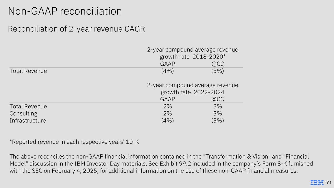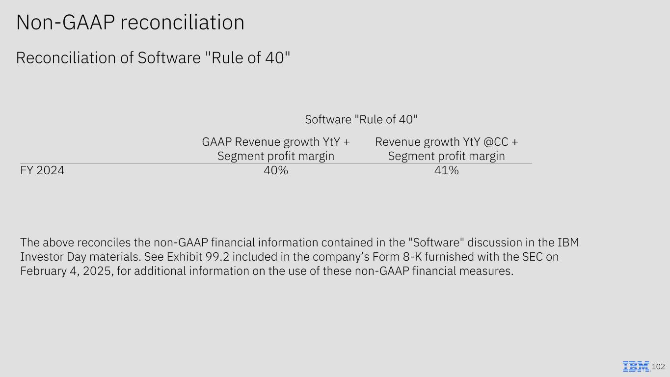 Non-GAAP reconciliation Reconciliation of 2-year revenue CAGR 101 2-year compound average revenue growth rate 2018-2020* GAAP @CC Total Revenue (4%) (3%) 2-year compound average revenue growth rate 2022-2024 GAAP @CC Total Revenue 2% 3% Consulting 2% 3% Infrastructure (4%) (3%) *Reported revenue in each respective years' 10-K The above reconciles the non-GAAP financial information contained in the "Transformation & Vision" and "Financial Model" discussion in the IBM Investor Day materials. See Exhibit 99.2 included in the company’s Form 8-K furnished with the SEC on February 4, 2025, for additional information on the use of these non-GAAP financial measures.