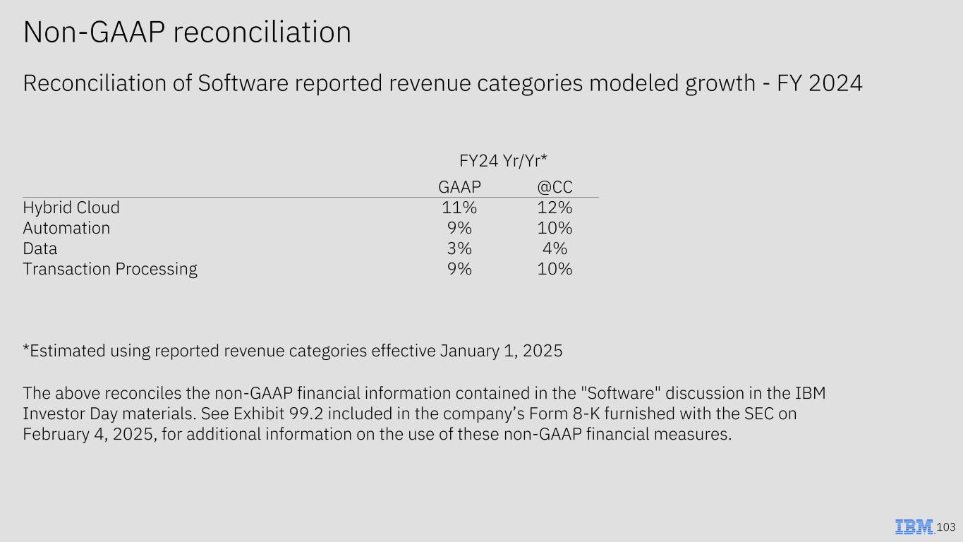 103 Non-GAAP reconciliation Reconciliation of Software reported revenue categories modeled growth - FY 2024 FY24 Yr/Yr* GAAP @CC Hybrid Cloud 11% 12% Automation 9% 10% Data 3% 4% Transaction Processing 9% 10% *Estimated using reported revenue categories effective January 1, 2025 The above reconciles the non-GAAP financial information contained in the "Software" discussion in the IBM Investor Day materials. See Exhibit 99.2 included in the company’s Form 8-K furnished with the SEC on February 4, 2025, for additional information on the use of these non-GAAP financial measures.