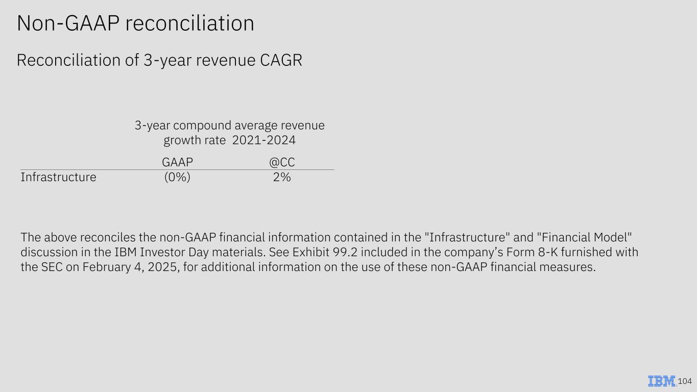 104 Non-GAAP reconciliation Reconciliation of 3-year revenue CAGR 3-year compound average revenue growth rate 2021-2024 GAAP @CC Infrastructure (0%) 2% The above reconciles the non-GAAP financial information contained in the "Infrastructure" and "Financial Model" discussion in the IBM Investor Day materials. See Exhibit 99.2 included in the company’s Form 8-K furnished with the SEC on February 4, 2025, for additional information on the use of these non-GAAP financial measures.