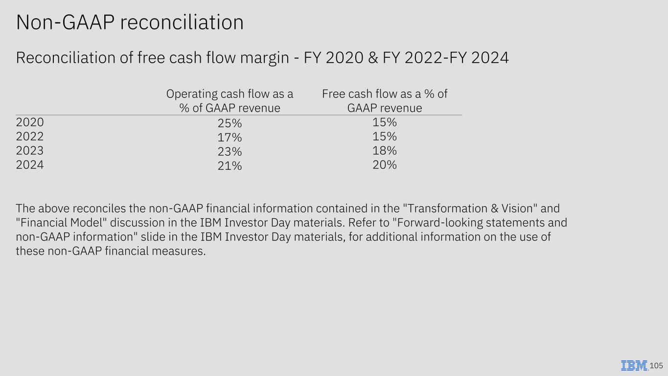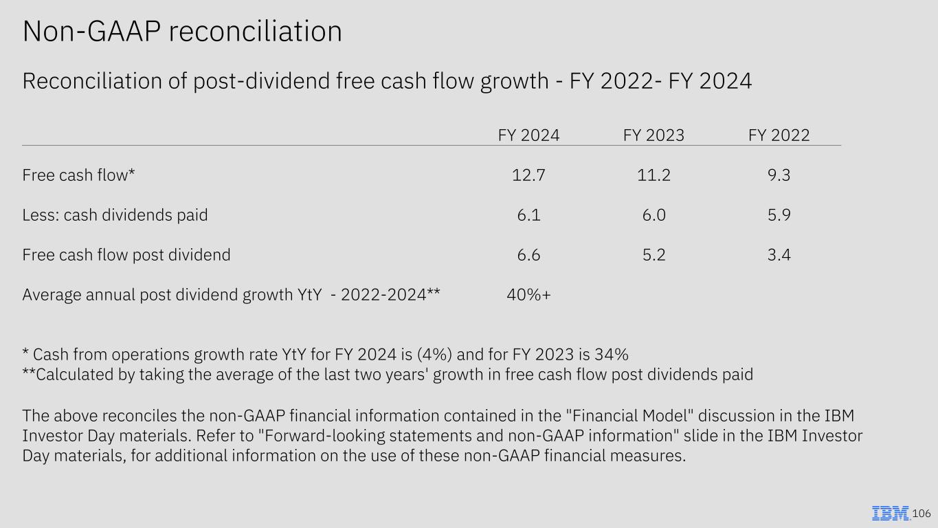 105 Non-GAAP reconciliation Reconciliation of free cash flow margin - FY 2020 & FY 2022-FY 2024 Operating cash flow as a % of GAAP revenue Free cash flow as a % of GAAP revenue 2020 25% 15% 2022 17% 15% 2023 23% 18% 2024 21% 20% The above reconciles the non-GAAP financial information contained in the "Transformation & Vision" and "Financial Model" discussion in the IBM Investor Day materials. Refer to "Forward-looking statements and non-GAAP information" slide in the IBM Investor Day materials, for additional information on the use of these non-GAAP financial measures.