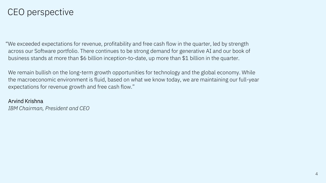 “We exceeded expectations for revenue, profitability and free cash flow in the quarter, led by strength across our Software portfolio. There continues to be strong demand for generative AI and our book of business stands at more than $6 billion inception-to-date, up more than $1 billion in the quarter. We remain bullish on the long-term growth opportunities for technology and the global economy. While the macroeconomic environment is fluid, based on what we know today, we are maintaining our full-year expectations for revenue growth and free cash flow.” Arvind Krishna IBM Chairman, President and CEO 4 CEO perspective