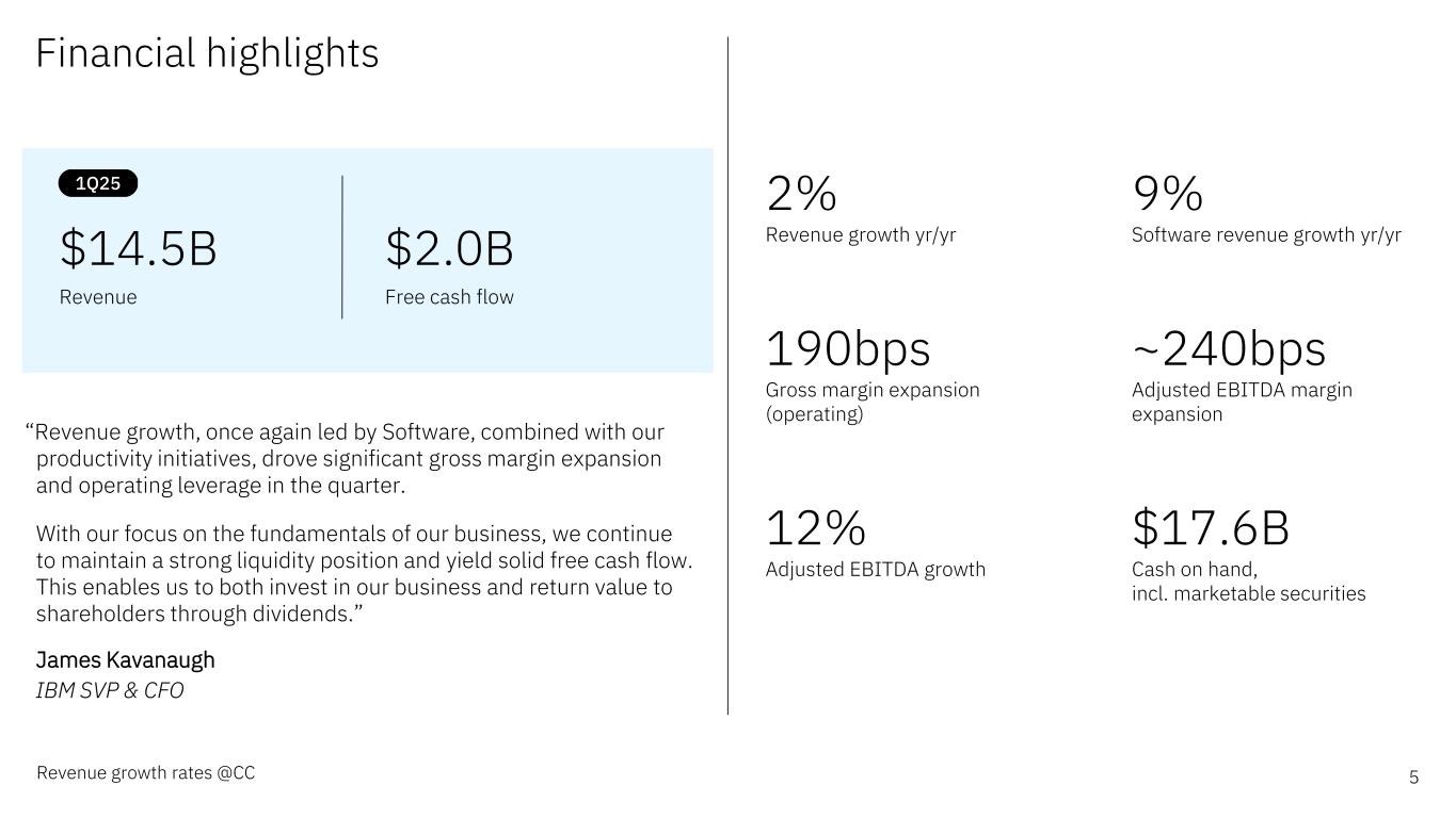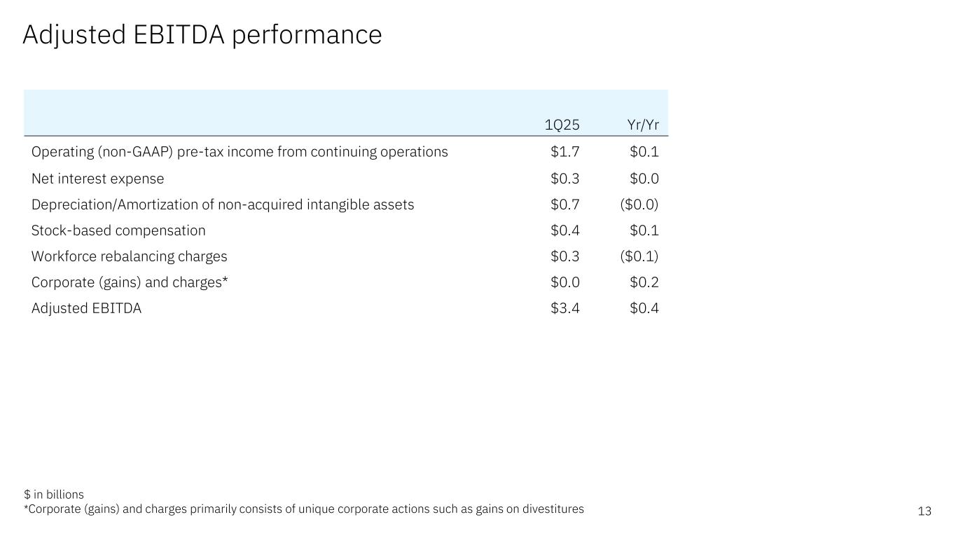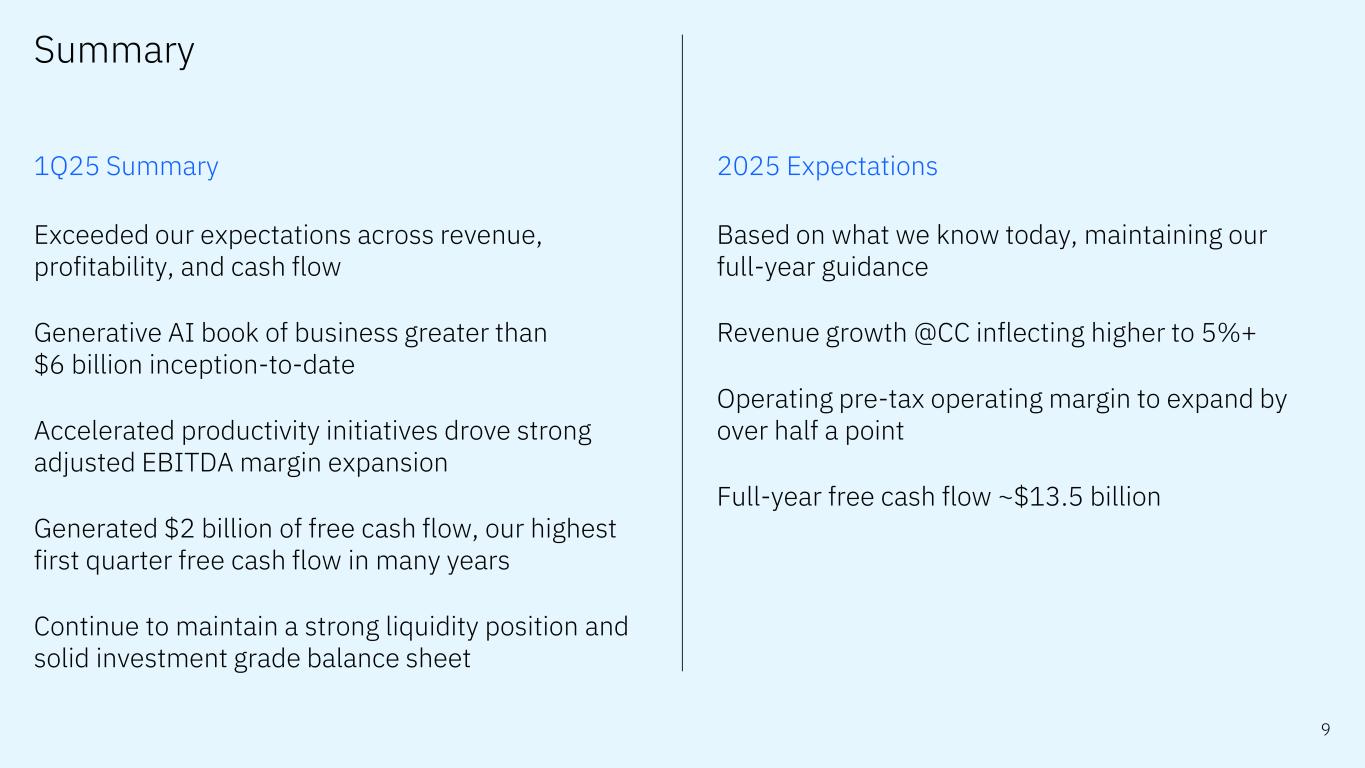 Forward-looking statements and non-GAAP information Certain comments made in this presentation may be characterized as forward looking under the Private Securities Litigation Reform Act of 1995. Forward- looking statements are based on the company’s current assumptions regarding future business and financial performance. Those statements by their nature address matters that are uncertain to different degrees. Those statements involve a number of factors that could cause actual results to differ materially. Additional information concerning these factors is contained in the Company’s filings with the SEC. Copies are available from the SEC, from the IBM website, or from IBM Investor Relations. Any forward-looking statement made during this presentation speaks only as of the date on which it is made. The company assumes no obligation to update or revise any forward-looking statements except as required by law; these charts and the associated remarks and comments are integrally related and are intended to be presented and understood together. In an effort to provide additional and useful information regarding the company’s financial results and other financial information as determined by generally accepted accounting principles (GAAP), the company also discusses, in its earnings press release and presentation materials, certain non-GAAP information including operating earnings and other “operating” financial measures, free cash flow, net cash from operating activities excluding IBM Financing receivables, adjusted EBITDA and adjustments for currency. The rationale for management’s use of this non-GAAP information is included as Exhibit 99.2 to the company’s Form 8-K submitted to the SEC on April 23, 2025. The reconciliation of non- GAAP information to GAAP is included in the press release within Exhibit 99.1 to the company’s Form 8-K submitted to the SEC on April 23, 2025, as well as on the slides entitled “Non-GAAP supplemental materials” in this presentation. To provide better transparency, the company also discusses management performance metrics including annual recurring revenue, annual bookings, signings, and book-to-bill. The metrics are used to monitor the performance of the business and are viewed as useful decision-making information for management and stakeholders. The rationale for management’s use of these performance metrics and their calculation, as well as other information including the definition of book of business, are included in Exhibit 99.2 to the company’s Form 8-K submitted to the SEC on April 23, 2025, or in the Management Discussion section of the company’s 2024 Annual Report, which is Exhibit 13 to the Form 10-K submitted with the SEC on February 25, 2025. For other related information please visit the Company’s investor relations website at: https://www.ibm.com/investor/events/earnings-1Q25 2