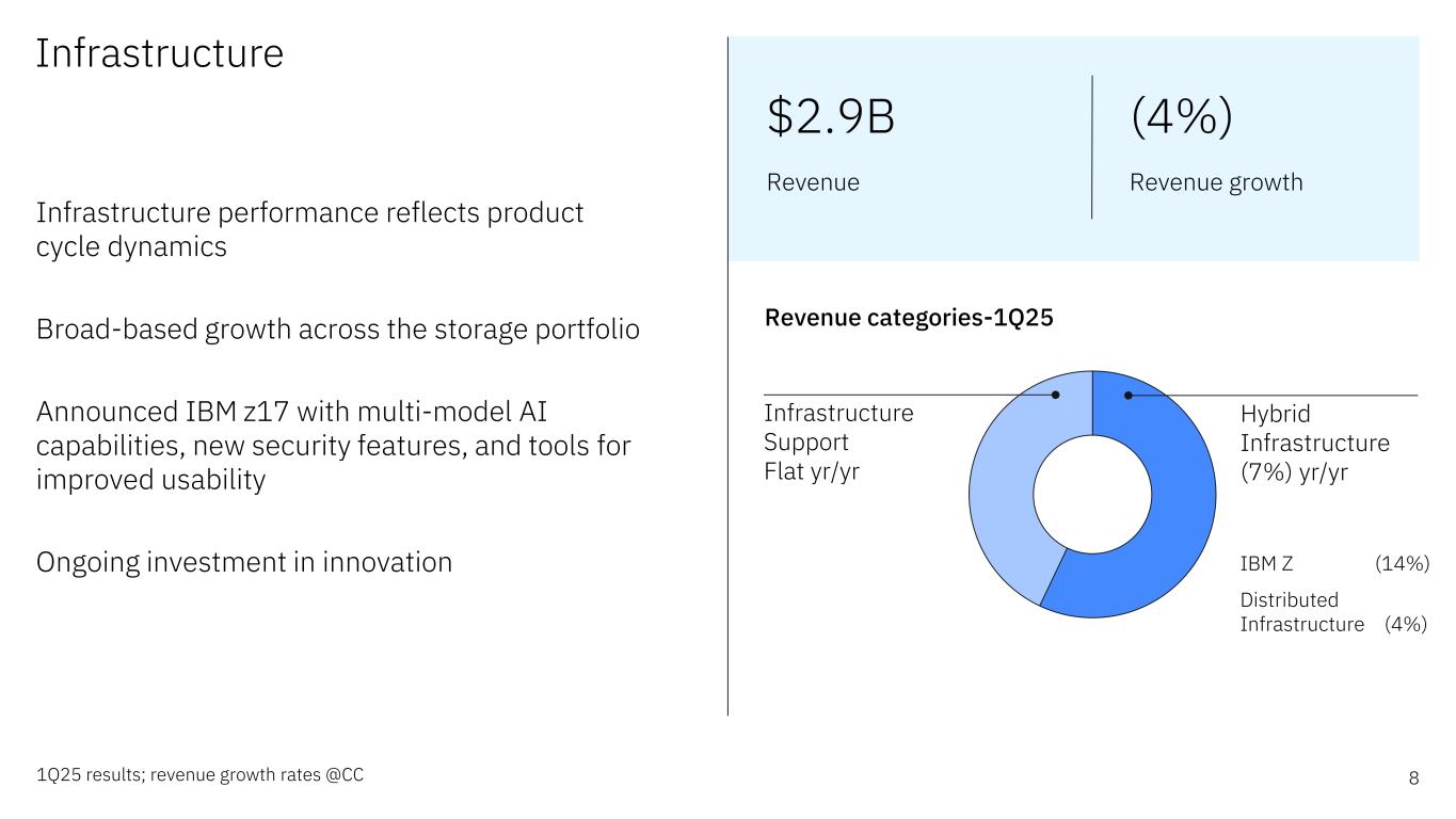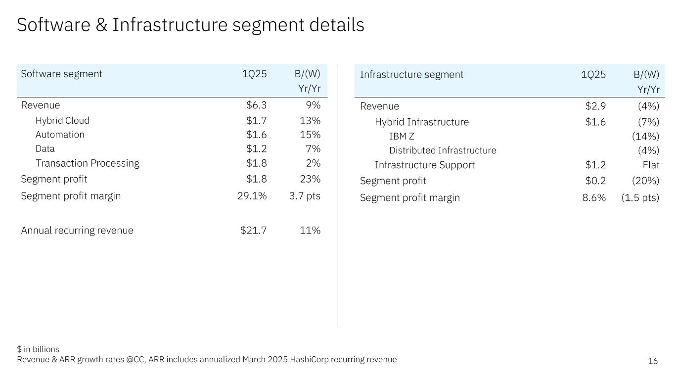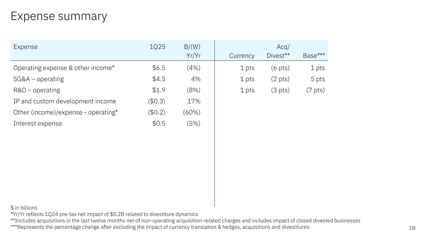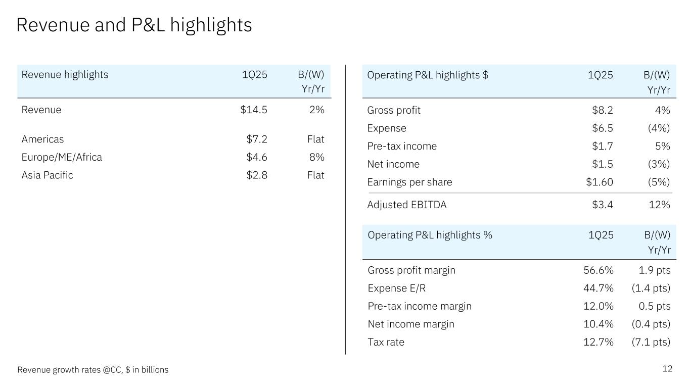Forward-looking statements and non-GAAP information Certain comments made in this presentation may be characterized as forward looking under the Private Securities Litigation Reform Act of 1995. Forward- looking statements are based on the company’s current assumptions regarding future business and financial performance. Those statements by their nature address matters that are uncertain to different degrees. Those statements involve a number of factors that could cause actual results to differ materially. Additional information concerning these factors is contained in the Company’s filings with the SEC. Copies are available from the SEC, from the IBM website, or from IBM Investor Relations. Any forward-looking statement made during this presentation speaks only as of the date on which it is made. The company assumes no obligation to update or revise any forward-looking statements except as required by law; these charts and the associated remarks and comments are integrally related and are intended to be presented and understood together. In an effort to provide additional and useful information regarding the company’s financial results and other financial information as determined by generally accepted accounting principles (GAAP), the company also discusses, in its earnings press release and presentation materials, certain non-GAAP information including operating earnings and other “operating” financial measures, free cash flow, net cash from operating activities excluding IBM Financing receivables, adjusted EBITDA and adjustments for currency. The rationale for management’s use of this non-GAAP information is included as Exhibit 99.2 to the company’s Form 8-K submitted to the SEC on April 23, 2025. The reconciliation of non- GAAP information to GAAP is included in the press release within Exhibit 99.1 to the company’s Form 8-K submitted to the SEC on April 23, 2025, as well as on the slides entitled “Non-GAAP supplemental materials” in this presentation. To provide better transparency, the company also discusses management performance metrics including annual recurring revenue, annual bookings, signings, and book-to-bill. The metrics are used to monitor the performance of the business and are viewed as useful decision-making information for management and stakeholders. The rationale for management’s use of these performance metrics and their calculation, as well as other information including the definition of book of business, are included in Exhibit 99.2 to the company’s Form 8-K submitted to the SEC on April 23, 2025, or in the Management Discussion section of the company’s 2024 Annual Report, which is Exhibit 13 to the Form 10-K submitted with the SEC on February 25, 2025. For other related information please visit the Company’s investor relations website at: https://www.ibm.com/investor/events/earnings-1Q25 2