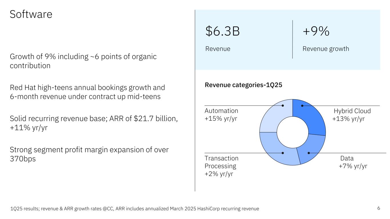 Financial highlights 5Revenue growth rates @CC $14.5B Revenue $2.0B Free cash flow 1Q25 “Revenue growth, once again led by Software, combined with our productivity initiatives, drove significant gross margin expansion and operating leverage in the quarter. With our focus on the fundamentals of our business, we continue to maintain a strong liquidity position and yield solid free cash flow. This enables us to both invest in our business and return value to shareholders through dividends.” James Kavanaugh IBM SVP & CFO 2% Revenue growth yr/yr 190bps Gross margin expansion (operating) 12% Adjusted EBITDA growth 9% Software revenue growth yr/yr ~240bps Adjusted EBITDA margin expansion $17.6B Cash on hand, incl. marketable securities