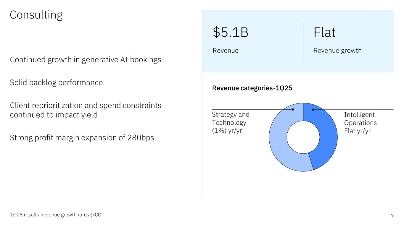 6 Revenue categories-1Q25 Software 1Q25 results; revenue & ARR growth rates @CC, ARR includes annualized March 2025 HashiCorp recurring revenue Growth of 9% including ~6 points of organic contribution Red Hat high-teens annual bookings growth and 6-month revenue under contract up mid-teens Solid recurring revenue base; ARR of $21.7 billion, +11% yr/yr Strong segment profit margin expansion of over 370bps $6.3B Revenue +9% Revenue growth Automation +15% yr/yr Hybrid Cloud +13% yr/yr Transaction Processing +2% yr/yr Data +7% yr/yr