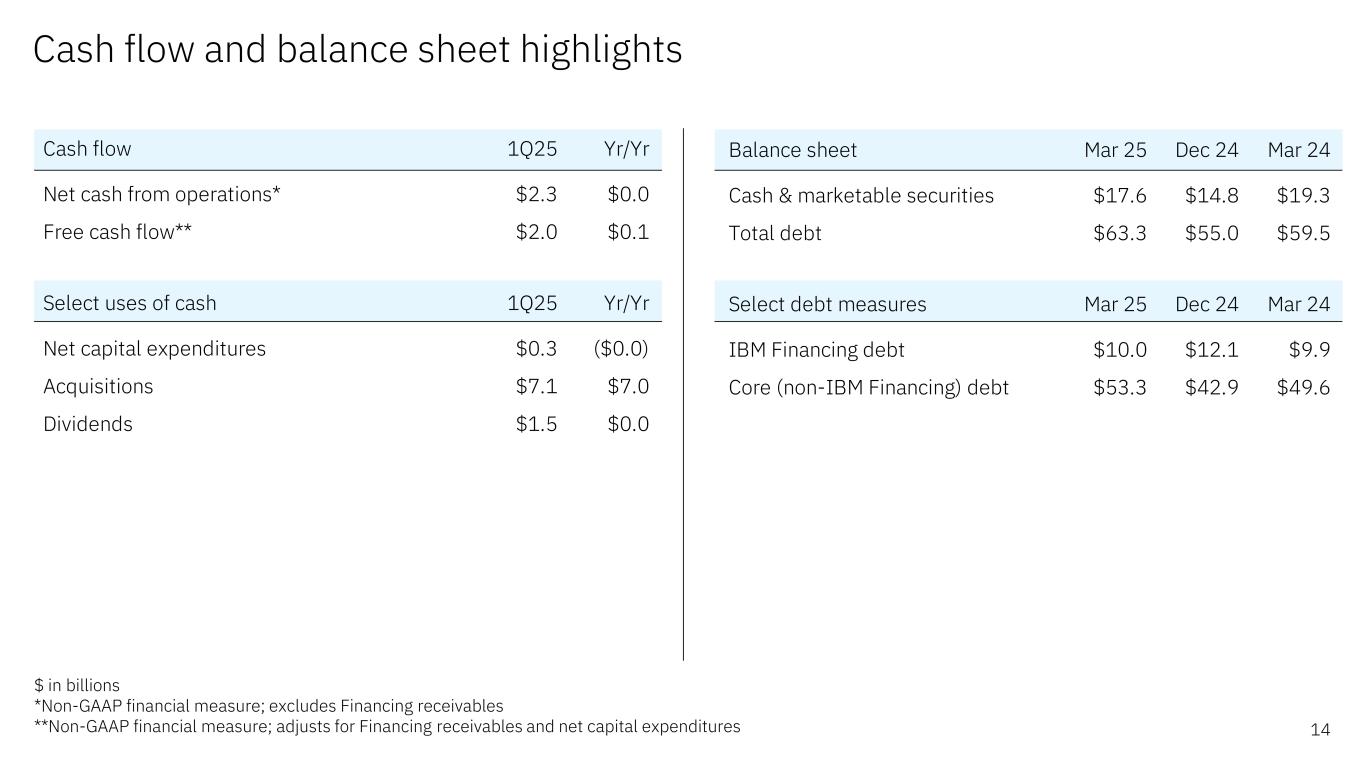 Adjusted EBITDA performance 13 $ in billions *Corporate (gains) and charges primarily consists of unique corporate actions such as gains on divestitures 1Q25 Yr/Yr Operating (non-GAAP) pre-tax income from continuing operations $1.7 $0.1 Net interest expense $0.3 $0.0 Depreciation/Amortization of non-acquired intangible assets $0.7 ($0.0) Stock-based compensation $0.4 $0.1 Workforce rebalancing charges $0.3 ($0.1) Corporate (gains) and charges* $0.0 $0.2 Adjusted EBITDA $3.4 $0.4