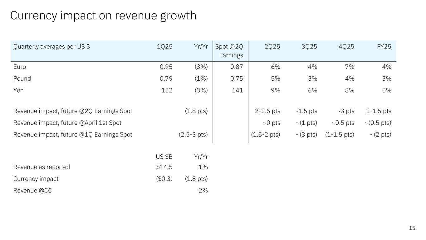 Cash flow and balance sheet highlights 14 $ in billions *Non-GAAP financial measure; excludes Financing receivables **Non-GAAP financial measure; adjusts for Financing receivables and net capital expenditures Cash flow 1Q25 Yr/Yr Net cash from operations* $2.3 $0.0 Free cash flow** $2.0 $0.1 Select uses of cash 1Q25 Yr/Yr Net capital expenditures $0.3 ($0.0) Acquisitions $7.1 $7.0 Dividends $1.5 $0.0 Balance sheet Mar 25 Dec 24 Mar 24 Cash & marketable securities $17.6 $14.8 $19.3 Total debt $63.3 $55.0 $59.5 Select debt measures Mar 25 Dec 24 Mar 24 IBM Financing debt $10.0 $12.1 $9.9 Core (non-IBM Financing) debt $53.3 $42.9 $49.6