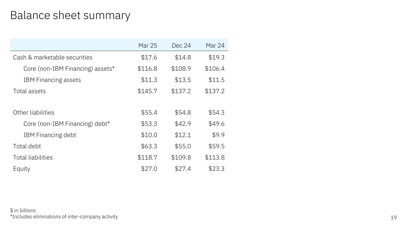 Balance sheet summary 19 $ in billions *Includes eliminations of inter-company activity Mar 25 Dec 24 Mar 24 Cash & marketable securities $17.6 $14.8 $19.3 Core (non-IBM Financing) assets* $116.8 $108.9 $106.4 IBM Financing assets $11.3 $13.5 $11.5 Total assets $145.7 $137.2 $137.2 Other liabilities $55.4 $54.8 $54.3 Core (non-IBM Financing) debt* $53.3 $42.9 $49.6 IBM Financing debt $10.0 $12.1 $9.9 Total debt $63.3 $55.0 $59.5 Total liabilities $118.7 $109.8 $113.8 Equity $27.0 $27.4 $23.3