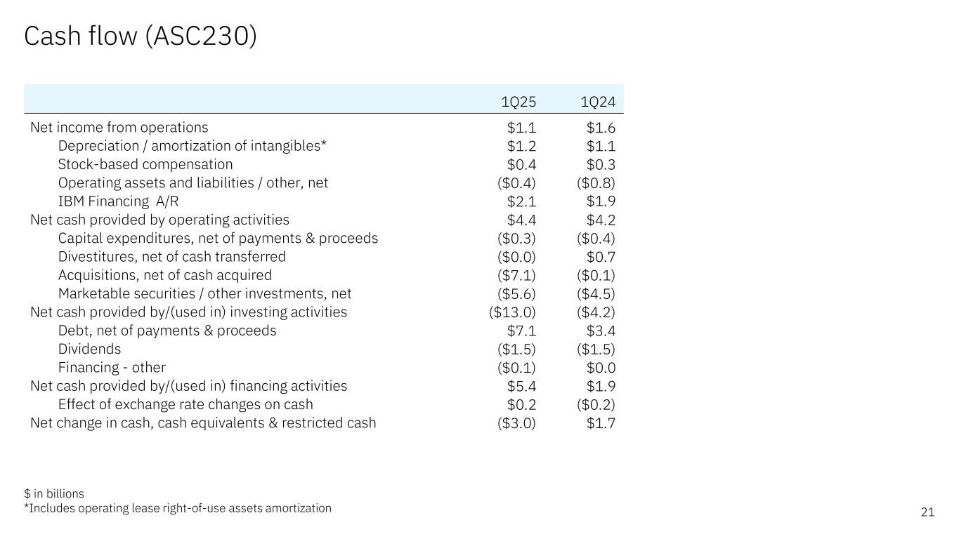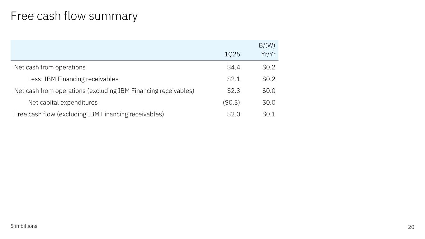 Free cash flow summary 20$ in billions B/(W) 1Q25 Yr/Yr Net cash from operations $4.4 $0.2 Less: IBM Financing receivables $2.1 $0.2 Net cash from operations (excluding IBM Financing receivables) $2.3 $0.0 Net capital expenditures ($0.3) $0.0 Free cash flow (excluding IBM Financing receivables) $2.0 $0.1