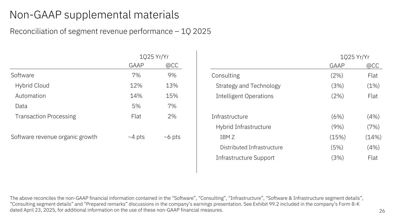 Non-GAAP supplemental materials Reconciliation of revenue performance – 1Q 2025 25 The above reconciles the non-GAAP financial information contained in the “Financial highlights”, “Revenue and P&L highlights”, and “Prepared remarks” discussions in the company’s earnings presentation. See Exhibit 99.2 included in the company’s Form 8-K dated April 23, 2025, for additional information on the use of these non-GAAP financial measures. GAAP @CC Total revenue 1% 2% Americas (1%) Flat Europe/ME/Africa 6% 8% Asia Pacific (2%) Flat 1Q25 Yr/Yr