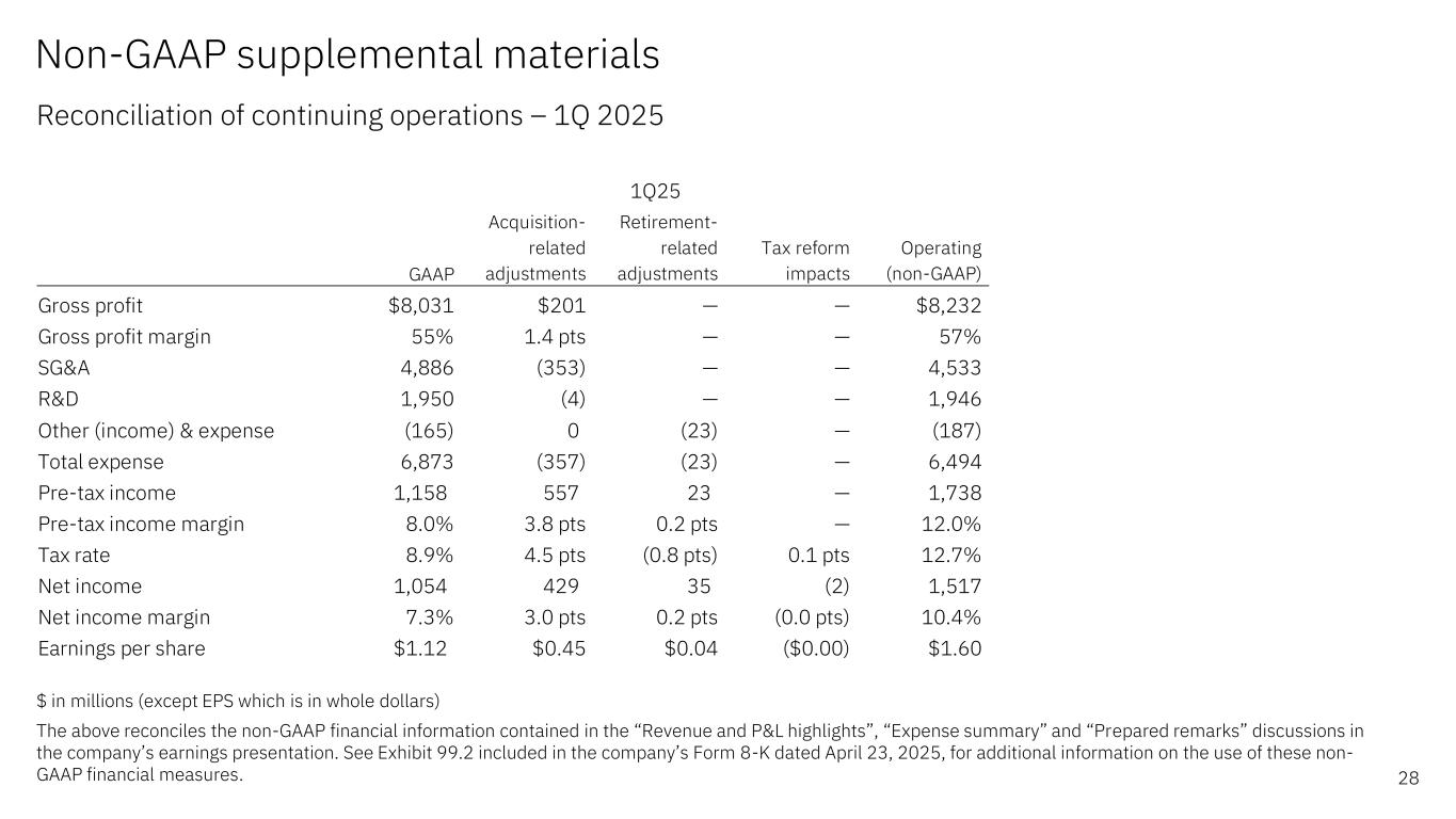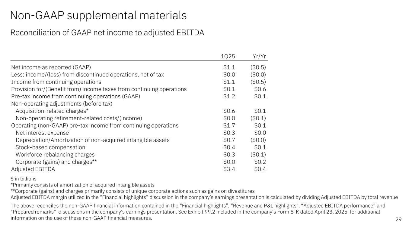 Non-GAAP supplemental materials Reconciliation of continuing operations – 1Q 2025 28 $ in millions (except EPS which is in whole dollars) The above reconciles the non-GAAP financial information contained in the “Revenue and P&L highlights”, “Expense summary” and “Prepared remarks” discussions in the company’s earnings presentation. See Exhibit 99.2 included in the company’s Form 8-K dated April 23, 2025, for additional information on the use of these non- GAAP financial measures. GAAP Acquisition- related adjustments Retirement- related adjustments Tax reform impacts Operating (non-GAAP) Gross profit $8,031 $201 — — $8,232 Gross profit margin 55% 1.4 pts — — 57% SG&A 4,886 (353) — — 4,533 R&D 1,950 (4) — — 1,946 Other (income) & expense (165) 0 (23) — (187) Total expense  6,873 (357) (23) — 6,494 Pre-tax income 1,158 557 23 — 1,738 Pre-tax income margin 8.0% 3.8 pts 0.2 pts — 12.0% Tax rate 8.9% 4.5 pts (0.8 pts) 0.1 pts 12.7% Net income 1,054 429 35 (2) 1,517 Net income margin 7.3% 3.0 pts 0.2 pts (0.0 pts) 10.4% Earnings per share $1.12 $0.45 $0.04 ($0.00) $1.60 1Q25