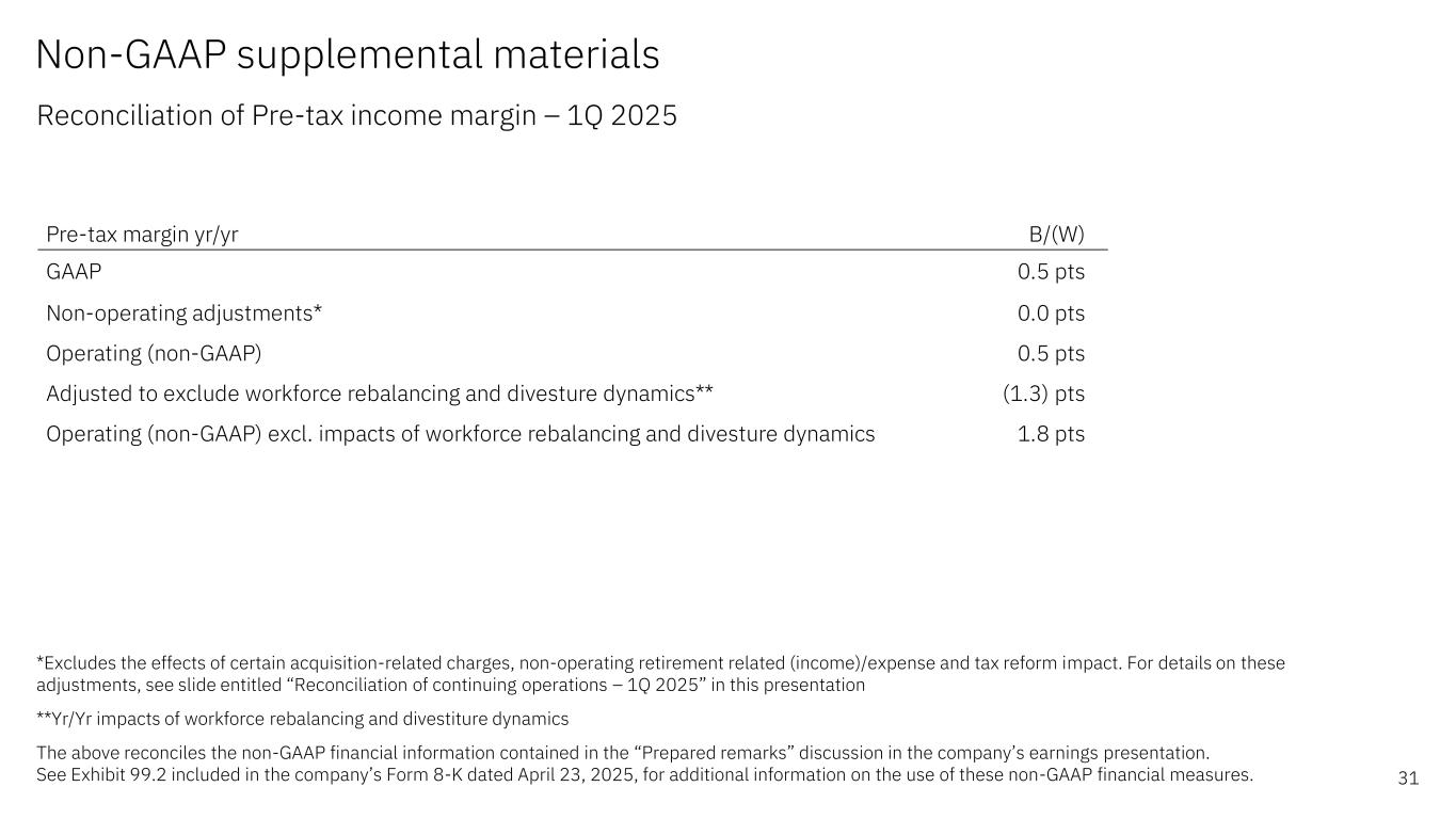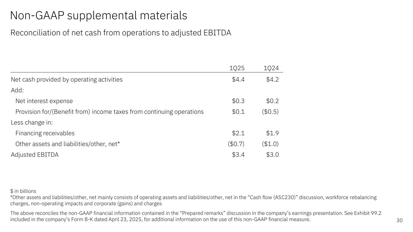 1Q25 Yr/Yr Net income as reported (GAAP) $1.1 ($0.5) Less: income/(loss) from discontinued operations, net of tax $0.0 ($0.0) Income from continuing operations $1.1 ($0.5) Provision for/(Benefit from) income taxes from continuing operations $0.1 $0.6 Pre-tax income from continuing operations (GAAP) $1.2 $0.1 Non-operating adjustments (before tax) Acquisition-related charges* $0.6 $0.1 Non-operating retirement-related costs/(income) $0.0 ($0.1) Operating (non-GAAP) pre-tax income from continuing operations $1.7 $0.1 Net interest expense $0.3 $0.0 Depreciation/Amortization of non-acquired intangible assets $0.7 ($0.0) Stock-based compensation $0.4 $0.1 Workforce rebalancing charges $0.3 ($0.1) Corporate (gains) and charges** $0.0 $0.2 Adjusted EBITDA $3.4 $0.4 Non-GAAP supplemental materials Reconciliation of GAAP net income to adjusted EBITDA 29 $ in billions *Primarily consists of amortization of acquired intangible assets **Corporate (gains) and charges primarily consists of unique corporate actions such as gains on divestitures Adjusted EBITDA margin utilized in the “Financial highlights” discussion in the company’s earnings presentation is calculated by dividing Adjusted EBITDA by total revenue The above reconciles the non-GAAP financial information contained in the “Financial highlights”, “Revenue and P&L highlights", “Adjusted EBITDA performance” and "Prepared remarks” discussions in the company’s earnings presentation. See Exhibit 99.2 included in the company’s Form 8-K dated April 23, 2025, for additional information on the use of these non-GAAP financial measures.