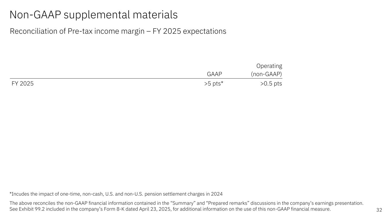 Non-GAAP supplemental materials Reconciliation of Pre-tax income margin – 1Q 2025 *Excludes the effects of certain acquisition-related charges, non-operating retirement related (income)/expense and tax reform impact. For details on these adjustments, see slide entitled “Reconciliation of continuing operations – 1Q 2025” in this presentation **Yr/Yr impacts of workforce rebalancing and divestiture dynamics The above reconciles the non-GAAP financial information contained in the “Prepared remarks” discussion in the company’s earnings presentation. See Exhibit 99.2 included in the company’s Form 8-K dated April 23, 2025, for additional information on the use of these non-GAAP financial measures. 31 Pre-tax margin yr/yr B/(W) GAAP 0.5 pts Non-operating adjustments* 0.0 pts Operating (non-GAAP) 0.5 pts Adjusted to exclude workforce rebalancing and divesture dynamics** (1.3) pts Operating (non-GAAP) excl. impacts of workforce rebalancing and divesture dynamics 1.8 pts