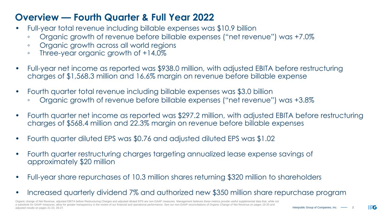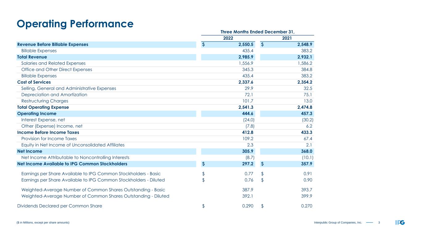 2Interpublic Group of Companies, Inc. Overview — Fourth Quarter & Full Year 2022 Organic change of Net Revenue, adjusted EBITA before Restructuring Charges and adjusted diluted EPS are non-GAAP measures. Management believes these metrics provide useful supplemental data that, while not a substitute for GAAP measures, allow for greater transparency in the review of our financial and operational performance. See our non-GAAP reconciliations of Organic Change of Net Revenue on pages 19-20 and adjusted results on pages 21-23, 26-27. • Full-year total revenue including billable expenses was $10.9 billion ◦ Organic growth of revenue before billable expenses (“net revenue”) was +7.0% ◦ Organic growth across all world regions ◦ Three-year organic growth of +14.0% • Full-year net income as reported was $938.0 million, with adjusted EBITA before restructuring charges of $1,568.3 million and 16.6% margin on revenue before billable expense • Fourth quarter total revenue including billable expenses was $3.0 billion ◦ Organic growth of revenue before billable expenses (“net revenue”) was +3.8% • Fourth quarter net income as reported was $297.2 million, with adjusted EBITA before restructuring charges of $568.4 million and 22.3% margin on revenue before billable expenses • Fourth quarter diluted EPS was $0.76 and adjusted diluted EPS was $1.02 • Fourth quarter restructuring charges targeting annualized lease expense savings of approximately $20 million • Full-year share repurchases of 10.3 million shares returning $320 million to shareholders • Increased quarterly dividend 7% and authorized new $350 million share repurchase program