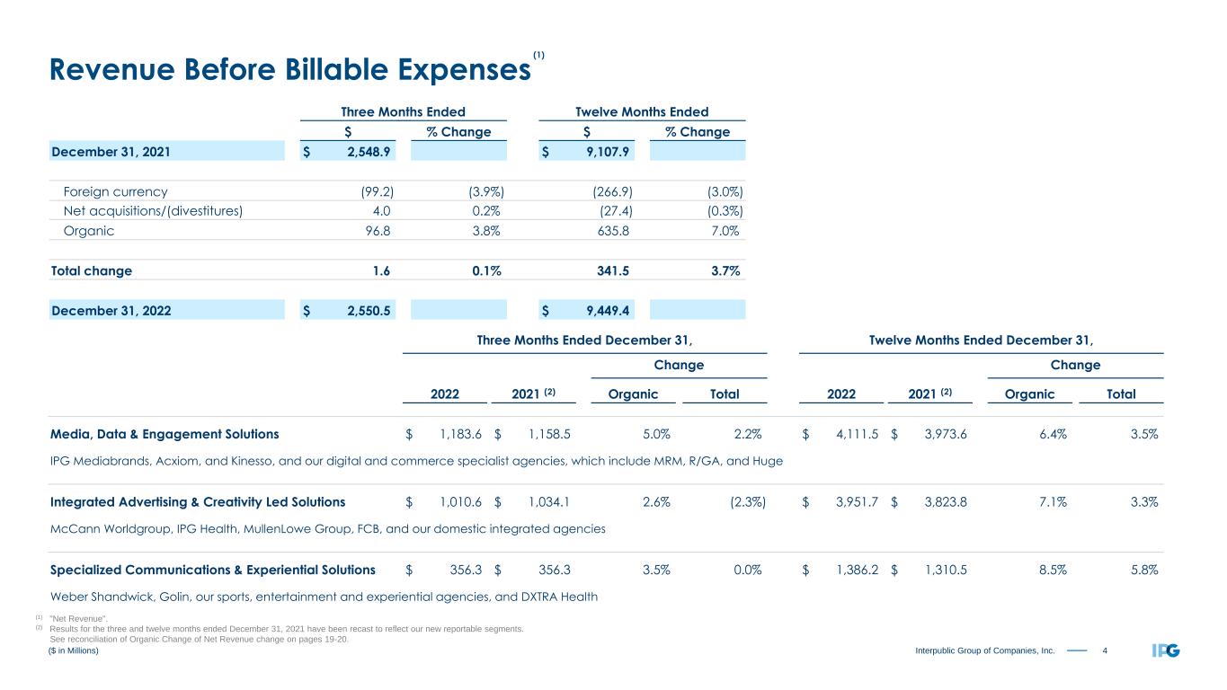 3Interpublic Group of Companies, Inc. Three Months Ended December 31, 2022 2021 Revenue Before Billable Expenses $ 2,550.5 $ 2,548.9 Billable Expenses 435.4 383.2 Total Revenue 2,985.9 2,932.1 Salaries and Related Expenses 1,556.9 1,586.2 Office and Other Direct Expenses 345.3 384.8 Billable Expenses 435.4 383.2 Cost of Services 2,337.6 2,354.2 Selling, General and Administrative Expenses 29.9 32.5 Depreciation and Amortization 72.1 75.1 Restructuring Charges 101.7 13.0 Total Operating Expense 2,541.3 2,474.8 Operating Income 444.6 457.3 Interest Expense, net (24.0) (30.2) Other (Expense) Income, net (7.8) 6.2 Income Before Income Taxes 412.8 433.3 Provision for Income Taxes 109.2 67.4 Equity in Net Income of Unconsolidated Affiliates 2.3 2.1 Net Income 305.9 368.0 Net Income Attributable to Noncontrolling Interests (8.7) (10.1) Net Income Available to IPG Common Stockholders $ 297.2 $ 357.9 Earnings per Share Available to IPG Common Stockholders - Basic $ 0.77 $ 0.91 Earnings per Share Available to IPG Common Stockholders - Diluted $ 0.76 $ 0.90 Weighted-Average Number of Common Shares Outstanding - Basic 387.9 393.7 Weighted-Average Number of Common Shares Outstanding - Diluted 392.1 399.9 Dividends Declared per Common Share $ 0.290 $ 0.270 ($ in Millions, except per share amounts) Operating Performance