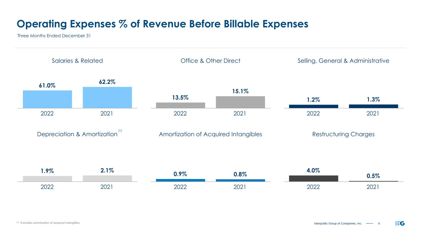 5Interpublic Group of Companies, Inc. Organic Change of Net Revenue by Region “All Other Markets” includes Canada, Africa and the Middle East. Circle proportions represent consolidated Net Revenue distribution. See reconciliation of Organic Change of Net Revenue, including total Net Revenue change, on page 19. Three Months Ended December 31, 2022 +2.4% United States +9.4% United Kingdom +5.7% Continental Europe +5.8% Latin America +3.0% Asia Pacific +6.1% International +3.8% Worldwide +6.9% All Other Markets