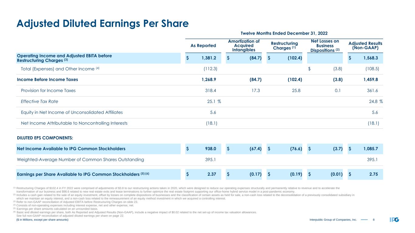 7Interpublic Group of Companies, Inc. Three Months Ended December 31, 2022 As Reported Amortization of Acquired Intangibles Restructuring Charges (1) Net Losses on Business Dispositions (2) Adjusted Results (Non-GAAP) Operating Income and Adjusted EBITA before Restructuring Charges (3) $ 444.6 $ (22.1) $ (101.7) $ 568.4 Total (Expenses) and Other Income (4) (31.8) $ (8.3) (23.5) Income Before Income Taxes 412.8 (22.1) (101.7) (8.3) 544.9 Provision for Income Taxes 109.2 4.6 26.0 0.0 139.8 Effective Tax Rate 26.5 % 25.7 % Equity in Net Income of Unconsolidated Affiliates 2.3 2.3 Net Income Attributable to Noncontrolling Interests (8.7) (8.7) DILUTED EPS COMPONENTS: Net Income Available to IPG Common Stockholders $ 297.2 $ (17.5) $ (75.7) $ (8.3) $ 398.7 Weighted-Average Number of Common Shares Outstanding 392.1 392.1 Earnings per Share Available to IPG Common Stockholders (5) (6) $ 0.76 $ (0.04) $ (0.19) $ (0.02) $ 1.02 ($ in Millions, except per share amounts) (1) Restructuring Charges of $101.7 in the fourth quarter of 2022 were comprised of adjustments of $3.1 to our restructuring actions taken in 2020, which were designed to reduce our operating expenses structurally and permanently relative to revenue and to accelerate the transformation of our business and $98.6 related to new real estate exits and lease terminations to further optimize the real estate footprint supporting our office-home hybrid service model in a post-pandemic economy. (2) Primarily relates to losses on complete dispositions of businesses and the classification of certain assets as held for sale, as well as a non-cash loss related to the remeasurement of an equity method investment in which we acquired a controlling interest. (3) Refer to non-GAAP reconciliation of Adjusted EBITA before Restructuring Charges on slide 23. (4) Consists of non-operating expenses including interest expense, net and other expense, net. (5) Earnings per share amounts calculated on an unrounded basis. (6) Basic and diluted earnings per share, both As Reported and Adjusted Results (Non-GAAP), include a negative impact of $0.02 related to the net set-up of income tax valuation allowances. See full non-GAAP reconciliation of adjusted diluted earnings per share on page 21. Adjusted Diluted Earnings Per Share