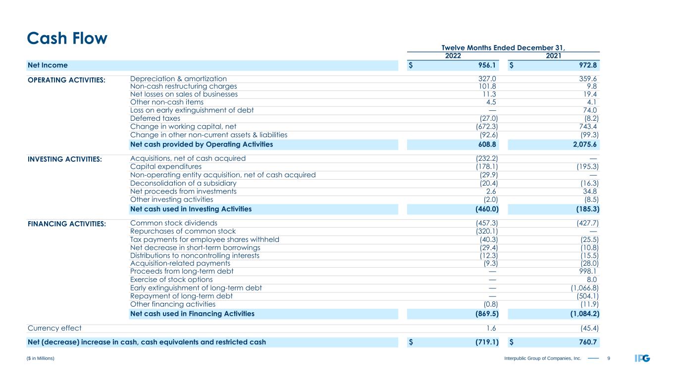 9Interpublic Group of Companies, Inc. Twelve Months Ended December 31, 2022 2021 Net Income $ 956.1 $ 972.8 OPERATING ACTIVITIES: Depreciation & amortization 327.0 359.6 Non-cash restructuring charges 101.8 9.8 Net losses on sales of businesses 11.3 19.4 Other non-cash items 4.5 4.1 Loss on early extinguishment of debt — 74.0 Deferred taxes (27.0) (8.2) Change in working capital, net (672.3) 743.4 Change in other non-current assets & liabilities (92.6) (99.3) Net cash provided by Operating Activities 608.8 2,075.6 INVESTING ACTIVITIES: Acquisitions, net of cash acquired (232.2) — Capital expenditures (178.1) (195.3) Non-operating entity acquisition, net of cash acquired (29.9) — Deconsolidation of a subsidiary (20.4) (16.3) Net proceeds from investments 2.6 34.8 Other investing activities (2.0) (8.5) Net cash used in Investing Activities (460.0) (185.3) FINANCING ACTIVITIES: Common stock dividends (457.3) (427.7) Repurchases of common stock (320.1) — Tax payments for employee shares withheld (40.3) (25.5) Net decrease in short-term borrowings (29.4) (10.8) Distributions to noncontrolling interests (12.3) (15.5) Acquisition-related payments (9.3) (28.0) Proceeds from long-term debt — 998.1 Exercise of stock options — 8.0 Early extinguishment of long-term debt — (1,066.8) Repayment of long-term debt — (504.1) Other financing activities (0.8) (11.9) Net cash used in Financing Activities (869.5) (1,084.2) Currency effect 1.6 (45.4) Net (decrease) increase in cash, cash equivalents and restricted cash $ (719.1) $ 760.7 ($ in Millions) Cash Flow