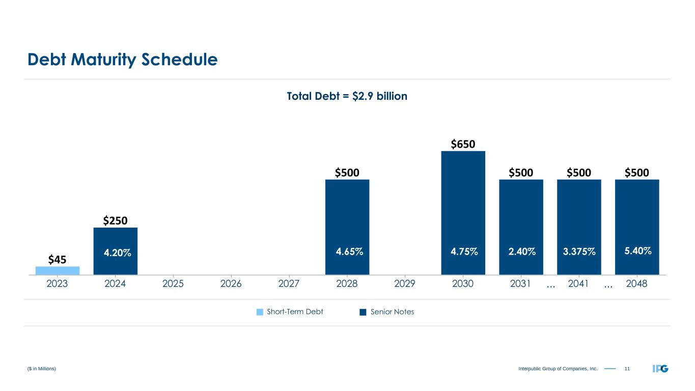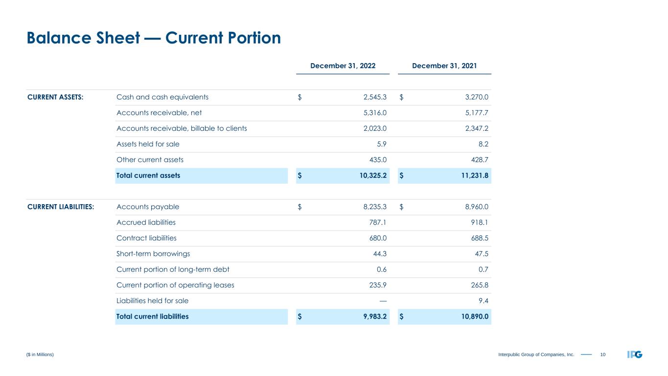 10Interpublic Group of Companies, Inc. December 31, 2022 December 31, 2021 CURRENT ASSETS: Cash and cash equivalents $ 2,545.3 $ 3,270.0 Accounts receivable, net 5,316.0 5,177.7 Accounts receivable, billable to clients 2,023.0 2,347.2 Assets held for sale 5.9 8.2 Other current assets 435.0 428.7 Total current assets $ 10,325.2 $ 11,231.8 CURRENT LIABILITIES: Accounts payable $ 8,235.3 $ 8,960.0 Accrued liabilities 787.1 918.1 Contract liabilities 680.0 688.5 Short-term borrowings 44.3 47.5 Current portion of long-term debt 0.6 0.7 Current portion of operating leases 235.9 265.8 Liabilities held for sale — 9.4 Total current liabilities $ 9,983.2 $ 10,890.0 ($ in Millions) Balance Sheet — Current Portion