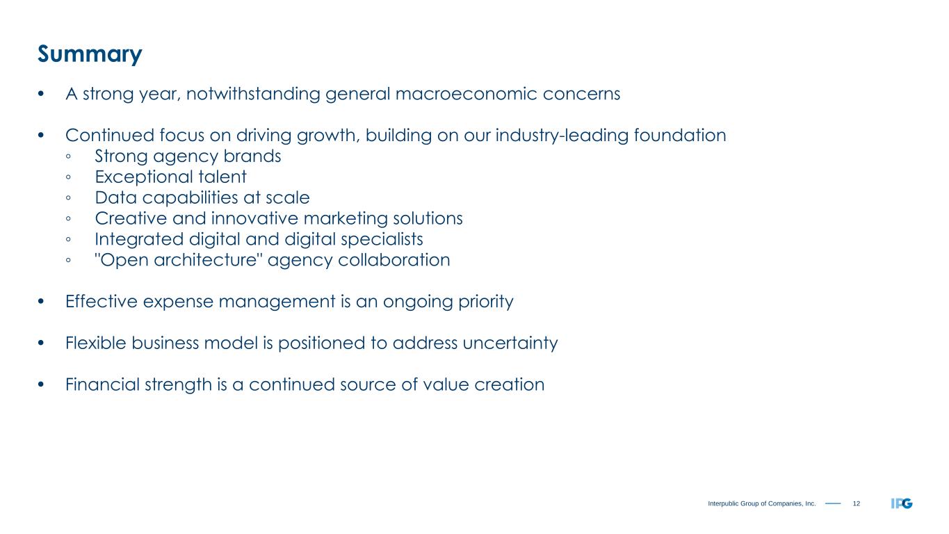 12Interpublic Group of Companies, Inc. Summary • A strong year, notwithstanding general macroeconomic concerns • Continued focus on driving growth, building on our industry-leading foundation ◦ Strong agency brands ◦ Exceptional talent ◦ Data capabilities at scale ◦ Creative and innovative marketing solutions ◦ Integrated digital and digital specialists ◦ "Open architecture" agency collaboration • Effective expense management is an ongoing priority • Flexible business model is positioned to address uncertainty • Financial strength is a continued source of value creation