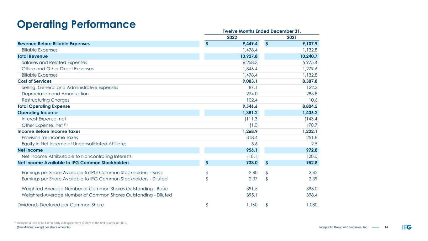 14Interpublic Group of Companies, Inc. Twelve Months Ended December 31, 2022 2021 Revenue Before Billable Expenses $ 9,449.4 $ 9,107.9 Billable Expenses 1,478.4 1,132.8 Total Revenue 10,927.8 10,240.7 Salaries and Related Expenses 6,258.3 5,975.4 Office and Other Direct Expenses 1,346.4 1,279.6 Billable Expenses 1,478.4 1,132.8 Cost of Services 9,083.1 8,387.8 Selling, General and Administrative Expenses 87.1 122.3 Depreciation and Amortization 274.0 283.8 Restructuring Charges 102.4 10.6 Total Operating Expense 9,546.6 8,804.5 Operating Income 1,381.2 1,436.2 Interest Expense, net (111.3) (143.4) Other Expense, net (1) (1.0) (70.7) Income Before Income Taxes 1,268.9 1,222.1 Provision for Income Taxes 318.4 251.8 Equity in Net Income of Unconsolidated Affiliates 5.6 2.5 Net Income 956.1 972.8 Net Income Attributable to Noncontrolling Interests (18.1) (20.0) Net Income Available to IPG Common Stockholders $ 938.0 $ 952.8 Earnings per Share Available to IPG Common Stockholders - Basic $ 2.40 $ 2.42 Earnings per Share Available to IPG Common Stockholders - Diluted $ 2.37 $ 2.39 Weighted-Average Number of Common Shares Outstanding - Basic 391.5 393.0 Weighted-Average Number of Common Shares Outstanding - Diluted 395.1 398.4 Dividends Declared per Common Share $ 1.160 $ 1.080 ($ in Millions, except per share amounts) Operating Performance (1) Includes a loss of $74.0 on early extinguishment of debt in the first quarter of 2021.