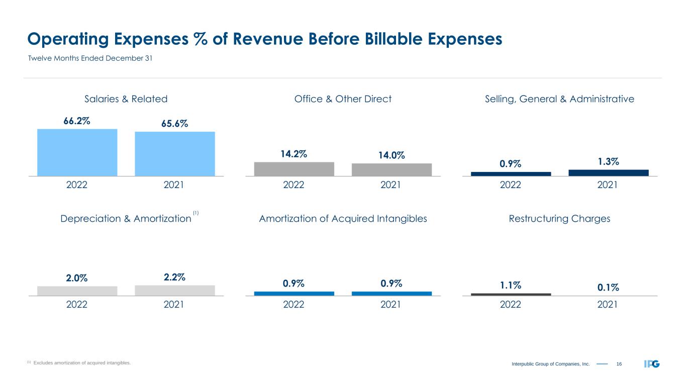 15Interpublic Group of Companies, Inc. Organic Change of Net Revenue by Region Twelve Months Ended December 31, 2022 +6.6% United States +5.2% United Kingdom +6.9% Continental Europe +12.9% Latin America +5.4% Asia Pacific +7.6% International +7.0% Worldwide +11.4% All Other Markets “All Other Markets” includes Canada, Africa and the Middle East. Circle proportions represent consolidated Net Revenue distribution. See reconciliation of Organic Change of Net Revenue, including total Net Revenue change, on page 20.