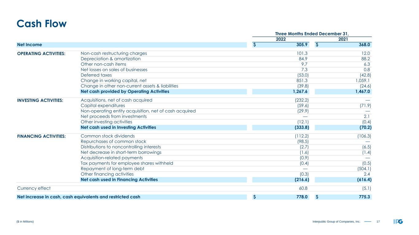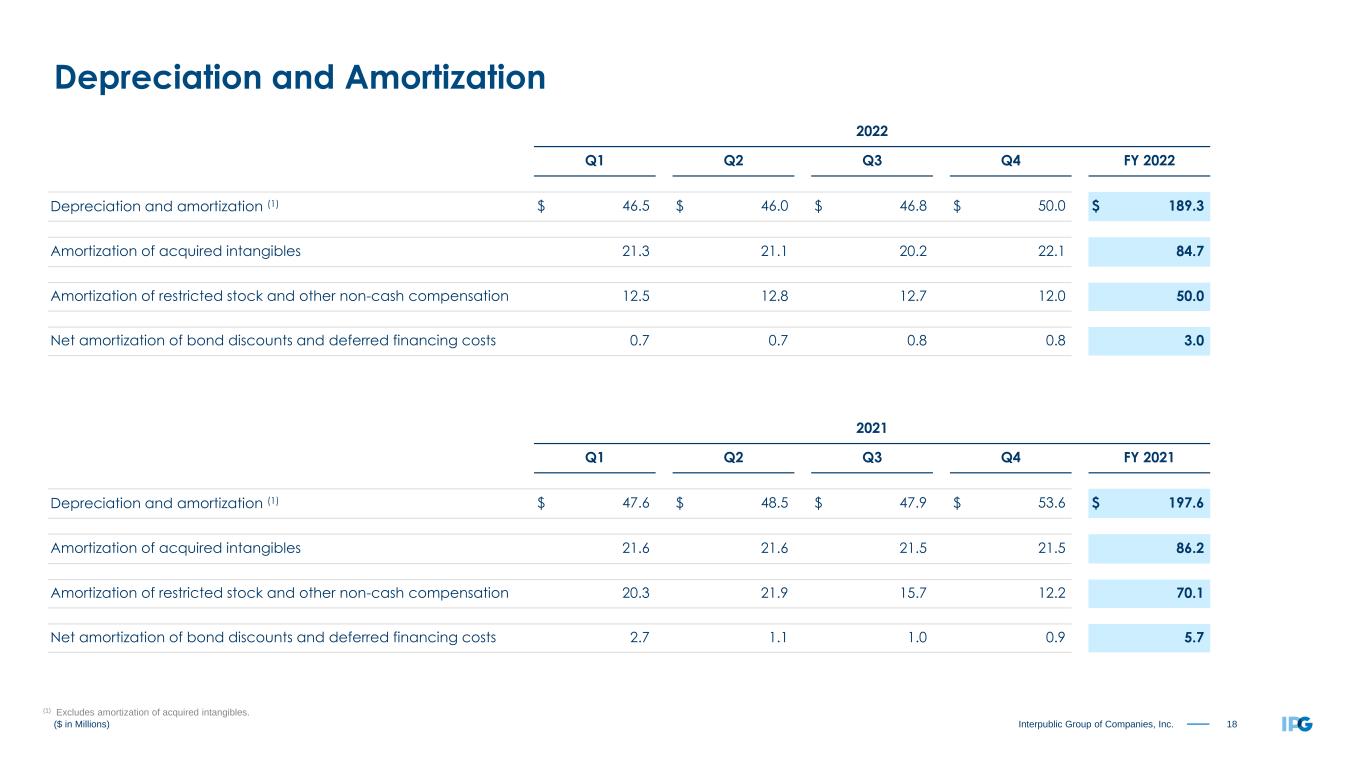 17Interpublic Group of Companies, Inc. Three Months Ended December 31, 2022 2021 Net Income $ 305.9 $ 368.0 OPERATING ACTIVITIES: Non-cash restructuring charges 101.3 12.0 Depreciation & amortization 84.9 88.2 Other non-cash items 9.7 6.3 Net losses on sales of businesses 7.3 0.8 Deferred taxes (53.0) (42.8) Change in working capital, net 851.3 1,059.1 Change in other non-current assets & liabilities (39.8) (24.6) Net cash provided by Operating Activities 1,267.6 1,467.0 INVESTING ACTIVITIES: Acquisitions, net of cash acquired (232.2) — Capital expenditures (59.6) (71.9) Non-operating entity acquisition, net of cash acquired (29.9) — Net proceeds from investments — 2.1 Other investing activities (12.1) (0.4) Net cash used in Investing Activities (333.8) (70.2) FINANCING ACTIVITIES: Common stock dividends (112.2) (106.3) Repurchases of common stock (98.5) — Distributions to noncontrolling interests (2.7) (6.5) Net decrease in short-term borrowings (1.6) (1.4) Acquisition-related payments (0.9) — Tax payments for employee shares withheld (0.4) (0.5) Repayment of long-term debt — (504.1) Other financing activities (0.3) 2.4 Net cash used in Financing Activities (216.6) (616.4) Currency effect 60.8 (5.1) Net increase in cash, cash equivalents and restricted cash $ 778.0 $ 775.3 ($ in Millions) Cash Flow