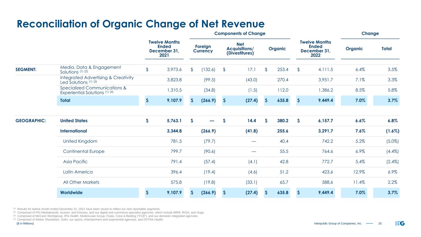 19Interpublic Group of Companies, Inc. Components of Change Change Three Months Ended December 31, 2021 Foreign Currency Net Acquisitions/ (Divestitures) Organic Three Months Ended December 31, 2022 Organic Total SEGMENT: Media, Data & Engagement Solutions (1) (2) $ 1,158.5 $ (49.6) $ 17.3 $ 57.4 $ 1,183.6 5.0% 2.2% Integrated Advertising & Creativity Led Solutions (1) (3) 1,034.1 (37.0) (13.3) 26.8 1,010.6 2.6% (2.3%) Specialized Communications & Experiential Solutions (1) (4) 356.3 (12.6) — 12.6 356.3 3.5% 0.0% Total $ 2,548.9 $ (99.2) $ 4.0 $ 96.8 $ 2,550.5 3.8% 0.1% GEOGRAPHIC: United States $ 1,558.5 $ — $ 14.4 $ 36.8 $ 1,609.7 2.4% 3.3% International 990.4 (99.2) (10.4) 60.0 940.8 6.1% (5.0%) United Kingdom 207.8 (28.8) — 19.5 198.5 9.4% (4.5%) Continental Europe 240.3 (28.6) — 13.7 225.4 5.7% (6.2%) Asia Pacific 237.8 (23.4) 1.6 7.2 223.2 3.0% (6.1%) Latin America 127.8 (7.0) (1.6) 7.4 126.6 5.8% (0.9%) All Other Markets 176.7 (11.4) (10.4) 12.2 167.1 6.9% (5.4%) Worldwide $ 2,548.9 $ (99.2) $ 4.0 $ 96.8 $ 2,550.5 3.8% 0.1% ($ in Millions) Reconciliation of Organic Change of Net Revenue (1) Results for three month ended December 31, 2021 have been recast to reflect our new reportable segments. (2) Comprised of IPG Mediabrands, Acxiom, and Kinesso, and our digital and commerce specialist agencies, which include MRM, R/GA, and Huge. (3) Comprised of McCann Worldgroup, IPG Health, MullenLowe Group, Foote, Cone & Belding ("FCB"), and our domestic integrated agencies. (4) Comprised of Weber Shandwick, Golin, our sports, entertainment and experiential agencies, and DXTRA Health.