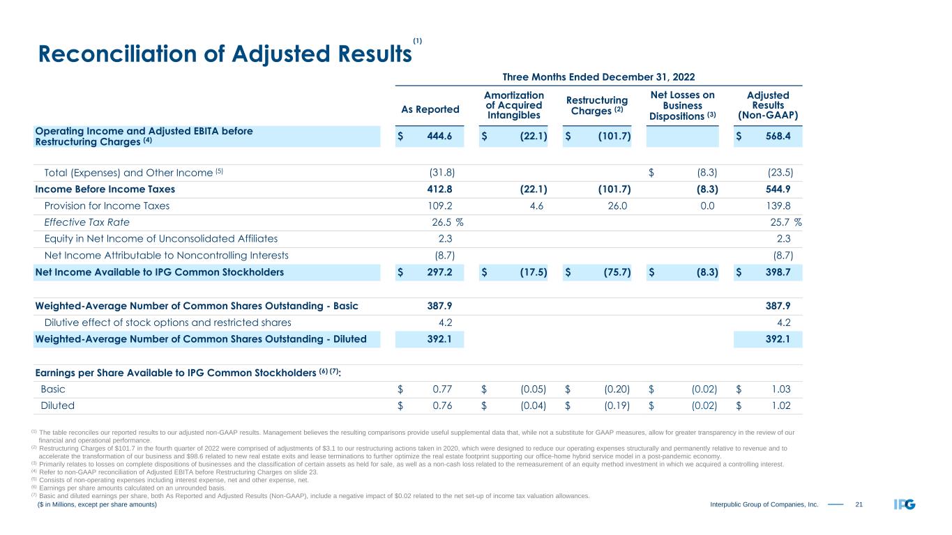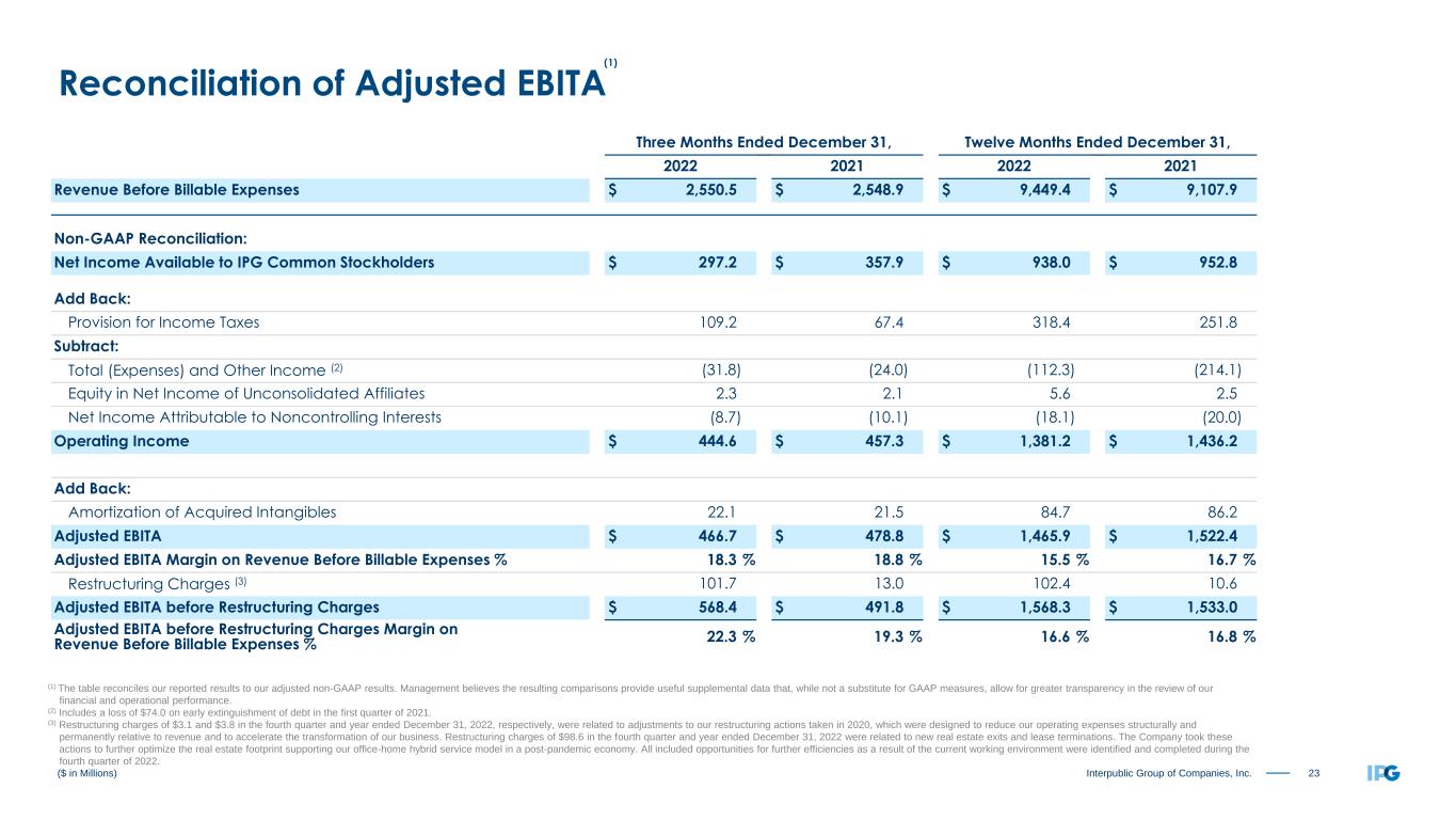 22Interpublic Group of Companies, Inc. Twelve Months Ended December 31, 2022 As Reported Amortization of Acquired Intangibles Restructuring Charges (2) Net Losses on Business Dispositions (3) Adjusted Results (Non-GAAP) Operating Income and Adjusted EBITA before Restructuring Charges (4) $ 1,381.2 $ (84.7) $ (102.4) $ 1,568.3 Total (Expenses) and Other Income (5) (112.3) $ (3.8) (108.5) Income Before Income Taxes 1,268.9 (84.7) (102.4) (3.8) 1,459.8 Provision for Income Taxes 318.4 17.3 25.8 0.1 361.6 Effective Tax Rate 25.1 % 24.8 % Equity in Net Income of Unconsolidated Affiliates 5.6 5.6 Net Income Attributable to Noncontrolling Interests (18.1) (18.1) Net Income Available to IPG Common Stockholders $ 938.0 $ (67.4) $ (76.6) $ (3.7) $ 1,085.7 Weighted-Average Number of Common Shares Outstanding - Basic 391.5 391.5 Dilutive effect of stock options and restricted shares 3.6 3.6 Weighted-Average Number of Common Shares Outstanding - Diluted 395.1 395.1 Earnings per Share Available to IPG Common Stockholders (6) (7): Basic $ 2.40 $ (0.17) $ (0.20) $ (0.01) $ 2.77 Diluted $ 2.37 $ (0.17) $ (0.19) $ (0.01) $ 2.75 ($ in Millions, except per share amounts) Reconciliation of Adjusted Results (1) The table reconciles our reported results to our adjusted non-GAAP results. Management believes the resulting comparisons provide useful supplemental data that, while not a substitute for GAAP measures, allow for greater transparency in the review of our financial and operational performance. (2) Restructuring Charges of $102.4 in FY 2022 were comprised of adjustments of $3.8 to our restructuring actions taken in 2020, which were designed to reduce our operating expenses structurally and permanently relative to revenue and to accelerate the transformation of our business and $98.6 related to new real estate exits and lease terminations to further optimize the real estate footprint supporting our office-home hybrid service model in a post-pandemic economy. (3) Includes a cash gain related to the sale of an equity investment, offset by losses on complete dispositions of businesses and the classification of certain assets as held for sale, a non-cash loss related to the deconsolidation of a previously consolidated subsidiary in which we maintain an equity interest, and a non-cash loss related to the remeasurement of an equity method investment in which we acquired a controlling interest. (4) Refer to non-GAAP reconciliation of Adjusted EBITA before Restructuring Charges on slide 23. (5) Consists of non-operating expenses including interest expense, net and other expense, net. (6) Earnings per share amounts calculated on an unrounded basis. (7) Basic and diluted earnings per share, both As Reported and Adjusted Results (Non-GAAP), include a negative impact of $0.02 related to the net set-up of income tax valuation allowances. (1)
