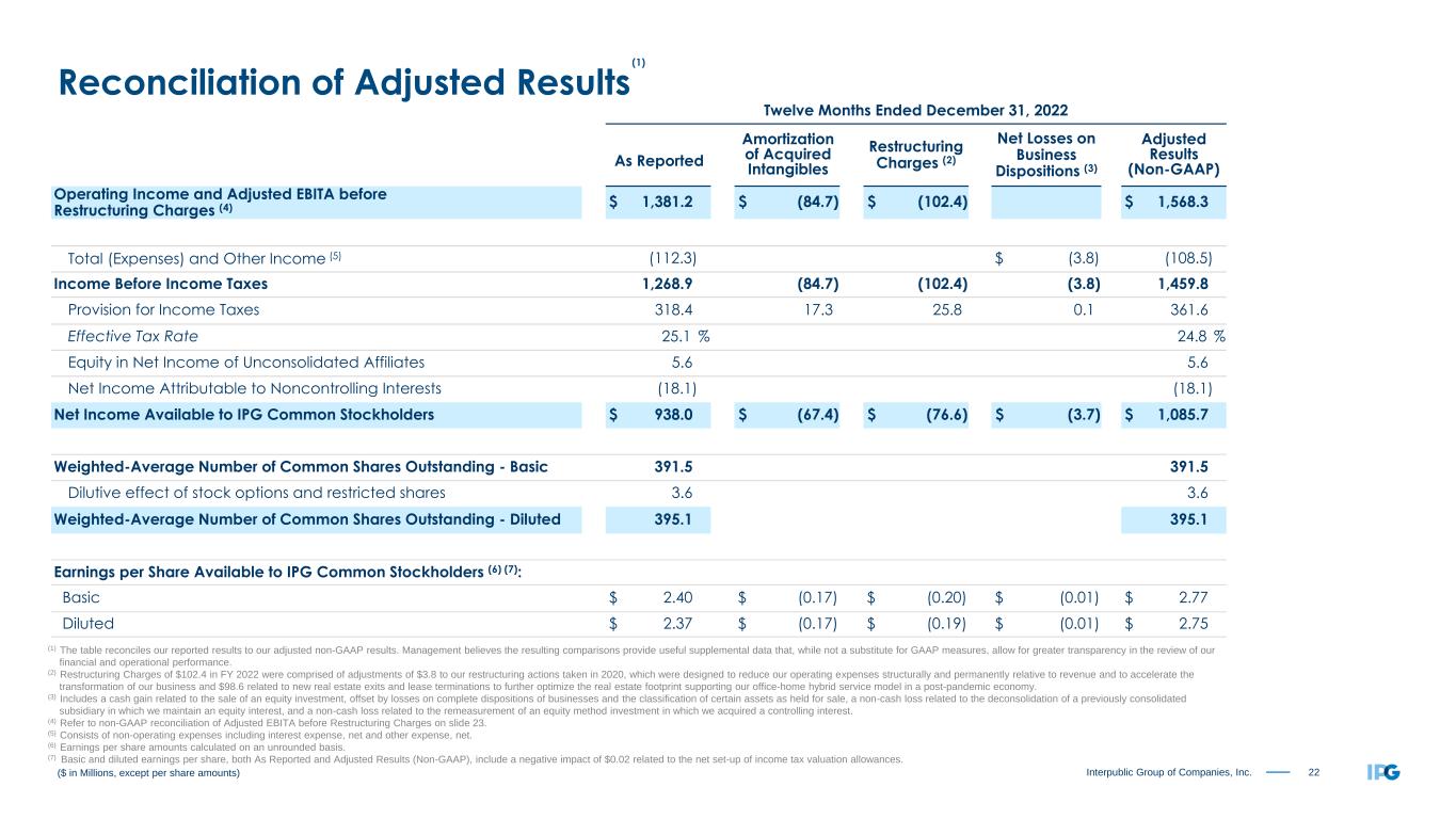 21Interpublic Group of Companies, Inc. Three Months Ended December 31, 2022 As Reported Amortization of Acquired Intangibles Restructuring Charges (2) Net Losses on Business Dispositions (3) Adjusted Results (Non-GAAP) Operating Income and Adjusted EBITA before Restructuring Charges (4) $ 444.6 $ (22.1) $ (101.7) $ 568.4 Total (Expenses) and Other Income (5) (31.8) $ (8.3) (23.5) Income Before Income Taxes 412.8 (22.1) (101.7) (8.3) 544.9 Provision for Income Taxes 109.2 4.6 26.0 0.0 139.8 Effective Tax Rate 26.5 % 25.7 % Equity in Net Income of Unconsolidated Affiliates 2.3 2.3 Net Income Attributable to Noncontrolling Interests (8.7) (8.7) Net Income Available to IPG Common Stockholders $ 297.2 $ (17.5) $ (75.7) $ (8.3) $ 398.7 Weighted-Average Number of Common Shares Outstanding - Basic 387.9 387.9 Dilutive effect of stock options and restricted shares 4.2 4.2 Weighted-Average Number of Common Shares Outstanding - Diluted 392.1 392.1 Earnings per Share Available to IPG Common Stockholders (6) (7): Basic $ 0.77 $ (0.05) $ (0.20) $ (0.02) $ 1.03 Diluted $ 0.76 $ (0.04) $ (0.19) $ (0.02) $ 1.02 ($ in Millions, except per share amounts) (1) The table reconciles our reported results to our adjusted non-GAAP results. Management believes the resulting comparisons provide useful supplemental data that, while not a substitute for GAAP measures, allow for greater transparency in the review of our financial and operational performance. (2) Restructuring Charges of $101.7 in the fourth quarter of 2022 were comprised of adjustments of $3.1 to our restructuring actions taken in 2020, which were designed to reduce our operating expenses structurally and permanently relative to revenue and to accelerate the transformation of our business and $98.6 related to new real estate exits and lease terminations to further optimize the real estate footprint supporting our office-home hybrid service model in a post-pandemic economy. (3) Primarily relates to losses on complete dispositions of businesses and the classification of certain assets as held for sale, as well as a non-cash loss related to the remeasurement of an equity method investment in which we acquired a controlling interest. (4) Refer to non-GAAP reconciliation of Adjusted EBITA before Restructuring Charges on slide 23. (5) Consists of non-operating expenses including interest expense, net and other expense, net. (6) Earnings per share amounts calculated on an unrounded basis. (7) Basic and diluted earnings per share, both As Reported and Adjusted Results (Non-GAAP), include a negative impact of $0.02 related to the net set-up of income tax valuation allowances. Reconciliation of Adjusted Results (1)