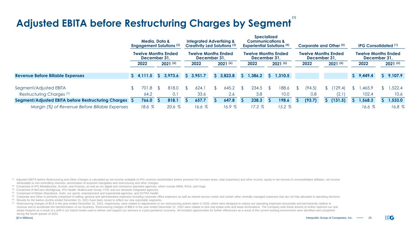 24Interpublic Group of Companies, Inc. ($ in Millions) (1) Adjusted EBITA before Restructuring and Other Charges is calculated as net income available to IPG common stockholders before provision for incomes taxes, total (expenses) and other income, equity in net income of unconsolidated affiliates, net income attributable to non-controlling interests, amortization of acquired intangibles and restructuring and other charges. (2) Comprised of IPG Mediabrands, Acxiom, and Kinesso, as well as our digital and commerce specialist agencies, which include MRM, R/GA, and Huge. (3) Comprised of McCann Worldgroup, IPG Health, MullenLowe Group, FCB, and our domestic integrated agencies. (4) Comprised of Weber Shandwick, Golin, our sports, entertainment and experiential agencies, and DXTRA Health. (5) Corporate and Other is primarily comprised of selling, general and administrative expenses including corporate office expenses as well as shared service center and certain other centrally managed expenses that are not fully allocated to operating divisions. (6) Results for the three months ended December 31, 2021 have been recast to reflect our new reportable segments. (7) Restructuring charges of $3.1 in the fourth quarter ended December 31, 2022, respectively, were related to adjustments to our restructuring actions taken in 2020, which were designed to reduce our operating expenses structurally and permanently relative to revenue and to accelerate the transformation of our business. Restructuring charges of $98.6 in the fourth quarter ended December 31, 2022 were related to new real estate exits and lease terminations. The Company took these actions to further optimize our real estate footprint as a result of a shift in our hybrid model used to deliver and support our services in a post-pandemic economy. All included opportunities for further efficiencies as a result of the current working environment were identified and completed during the fourth quarter of 2022. Media, Data & Engagement Solutions (2) Integrated Advertising & Creativity Led Solutions (3) Specialized Communications & Experiential Solutions (4) Corporate and Other (5) IPG Consolidated (1) Three Months Ended December 31, Three Months Ended December 31, Three Months Ended December 31, Three Months Ended December 31, Three Months Ended December 31, 2022 2021 (6) 2022 2021 (6) 2022 2021 (6) 2022 2021 (6) 2022 2021 (6) Revenue Before Billable Expenses $ 1,183.6 $ 1,158.5 $ 1,010.6 $ 1,034.1 $ 356.3 $ 356.3 $ 2,550.5 $ 2,548.9 Segment/Adjusted EBITA $ 284.9 $ 282.1 $ 159.2 $ 191.5 $ 55.2 $ 40.6 $ (32.6) $ (35.4) $ 466.7 $ 478.8 Restructuring Charges (7) 64.2 0.3 27.6 2.8 9.2 9.8 0.7 0.1 101.7 13.0 Segment/Adjusted EBITA before Restructuring Charges $ 349.1 $ 282.4 $ 186.8 $ 194.3 $ 64.4 $ 50.4 $ (31.9) $ (35.3) $ 568.4 $ 491.8 Margin (%) of Revenue Before Billable Expenses 29.5 % 24.4 % 18.5 % 18.8 % 18.1 % 14.1 % 22.3 % 19.3 % Adjusted EBITA before Restructuring Charges by Segment (1)
