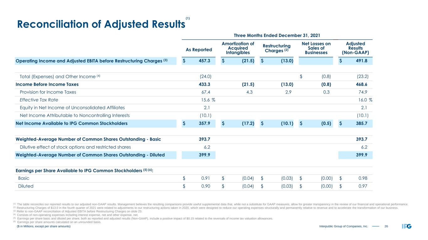 25Interpublic Group of Companies, Inc. ($ in Millions) Media, Data & Engagement Solutions (2) Integrated Advertising & Creativity Led Solutions (3) Specialized Communications & Experiential Solutions (4) Corporate and Other (5) IPG Consolidated (1) Twelve Months Ended December 31, Twelve Months Ended December 31, Twelve Months Ended December 31, Twelve Months Ended December 31, Twelve Months Ended December 31, 2022 2021 (6) 2022 2021 (6) 2022 2021 (6) 2022 2021 (6) 2022 2021 (6) Revenue Before Billable Expenses $ 4,111.5 $ 3,973.6 $ 3,951.7 $ 3,823.8 $ 1,386.2 $ 1,310.5 $ 9,449.4 $ 9,107.9 Segment/Adjusted EBITA $ 701.8 $ 818.0 $ 624.1 $ 645.2 $ 234.5 $ 188.6 $ (94.5) $ (129.4) $ 1,465.9 $ 1,522.4 Restructuring Charges (7) 64.2 0.1 33.6 2.6 3.8 10.0 0.8 (2.1) 102.4 10.6 Segment/Adjusted EBITA before Restructuring Charges $ 766.0 $ 818.1 $ 657.7 $ 647.8 $ 238.3 $ 198.6 $ (93.7) $ (131.5) $ 1,568.3 $ 1,533.0 Margin (%) of Revenue Before Billable Expenses 18.6 % 20.6 % 16.6 % 16.9 % 17.2 % 15.2 % 16.6 % 16.8 % Adjusted EBITA before Restructuring Charges by Segment (1) Adjusted EBITA before Restructuring and Other Charges is calculated as net income available to IPG common stockholders before provision for incomes taxes, total (expenses) and other income, equity in net income of unconsolidated affiliates, net income attributable to non-controlling interests, amortization of acquired intangibles and restructuring and other charges. (2) Comprised of IPG Mediabrands, Acxiom, and Kinesso, as well as our digital and commerce specialist agencies, which include MRM, R/GA, and Huge. (3) Comprised of McCann Worldgroup, IPG Health, MullenLowe Group, FCB, and our domestic integrated agencies. (4) Comprised of Weber Shandwick, Golin, our sports, entertainment and experiential agencies, and DXTRA Health. (5) Corporate and Other is primarily comprised of selling, general and administrative expenses including corporate office expenses as well as shared service center and certain other centrally managed expenses that are not fully allocated to operating divisions. (6) Results for the twelve months ended December 31, 2021 have been recast to reflect our new reportable segments. (7) Restructuring charges of $3.8 in the year ended December 31, 2022, respectively, were related to adjustments to our restructuring actions taken in 2020, which were designed to reduce our operating expenses structurally and permanently relative to revenue and to accelerate the transformation of our business. Restructuring charges of $98.6 in the year ended December 31, 2022 were related to new real estate exits and lease terminations. The Company took these actions to further optimize our real estate footprint as a result of a shift in our hybrid model used to deliver and support our services in a post-pandemic economy. All included opportunities for further efficiencies as a result of the current working environment were identified and completed during the fourth quarter of 2022. (1)