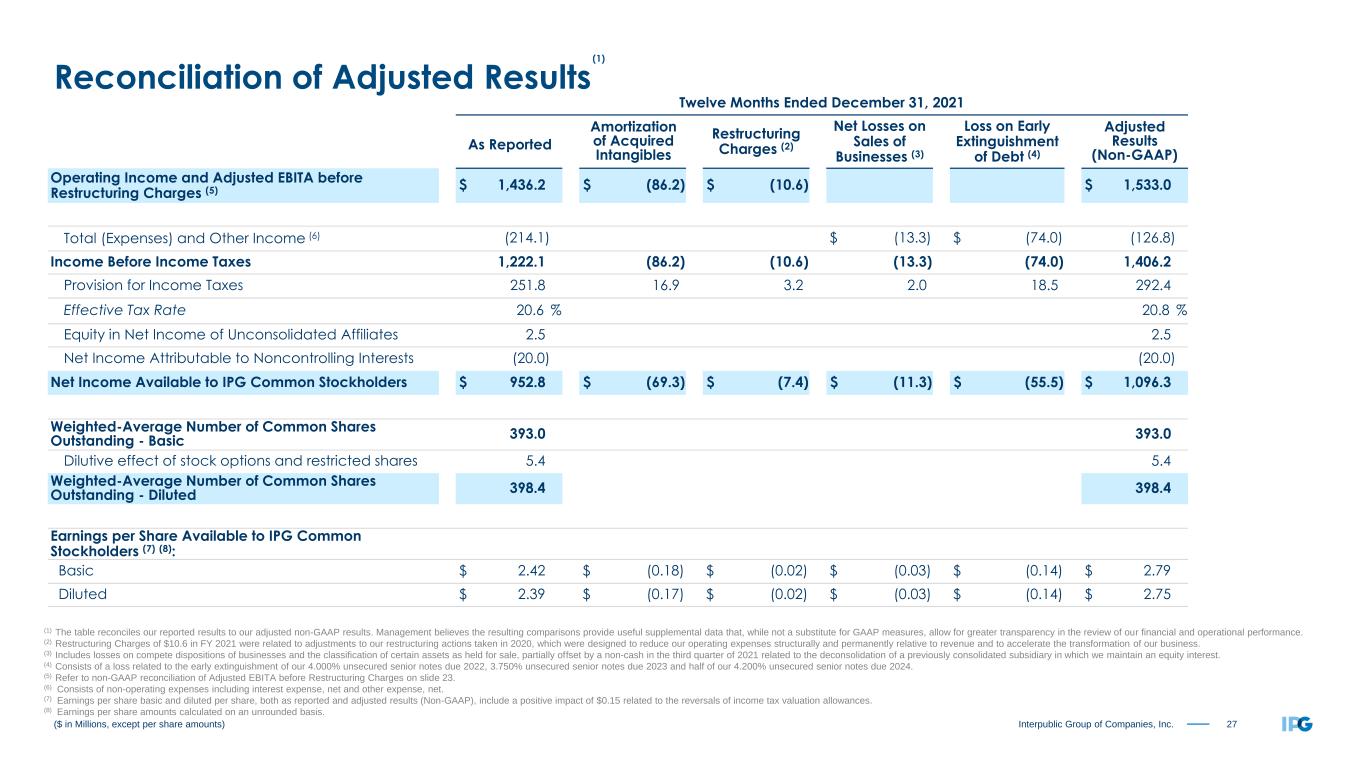 26Interpublic Group of Companies, Inc. Three Months Ended December 31, 2021 As Reported Amortization of Acquired Intangibles Restructuring Charges (2) Net Losses on Sales of Businesses Adjusted Results (Non-GAAP) Operating Income and Adjusted EBITA before Restructuring Charges (3) $ 457.3 $ (21.5) $ (13.0) $ 491.8 Total (Expenses) and Other Income (4) (24.0) $ (0.8) (23.2) Income Before Income Taxes 433.3 (21.5) (13.0) (0.8) 468.6 Provision for Income Taxes 67.4 4.3 2.9 0.3 74.9 Effective Tax Rate 15.6 % 16.0 % Equity in Net Income of Unconsolidated Affiliates 2.1 2.1 Net Income Attributable to Noncontrolling Interests (10.1) (10.1) Net Income Available to IPG Common Stockholders $ 357.9 $ (17.2) $ (10.1) $ (0.5) $ 385.7 Weighted-Average Number of Common Shares Outstanding - Basic 393.7 393.7 Dilutive effect of stock options and restricted shares 6.2 6.2 Weighted-Average Number of Common Shares Outstanding - Diluted 399.9 399.9 Earnings per Share Available to IPG Common Stockholders (5) (6): Basic $ 0.91 $ (0.04) $ (0.03) $ (0.00) $ 0.98 Diluted $ 0.90 $ (0.04) $ (0.03) $ (0.00) $ 0.97 ($ in Millions, except per share amounts) (1) The table reconciles our reported results to our adjusted non-GAAP results. Management believes the resulting comparisons provide useful supplemental data that, while not a substitute for GAAP measures, allow for greater transparency in the review of our financial and operational performance. (2) Restructuring Charges of $13.0 in the fourth quarter of 2021 were related to adjustments to our restructuring actions taken in 2020, which were designed to reduce our operating expenses structurally and permanently relative to revenue and to accelerate the transformation of our business. (3) Refer to non-GAAP reconciliation of Adjusted EBITA before Restructuring Charges on slide 23. (4) Consists of non-operating expenses including interest expense, net and other expense, net. (5) Earnings per share basic and diluted per share, both as reported and adjusted results (Non-GAAP), include a positive impact of $0.15 related to the reversals of income tax valuation allowances. (6) Earnings per share amounts calculated on an unrounded basis. Reconciliation of Adjusted Results (1)