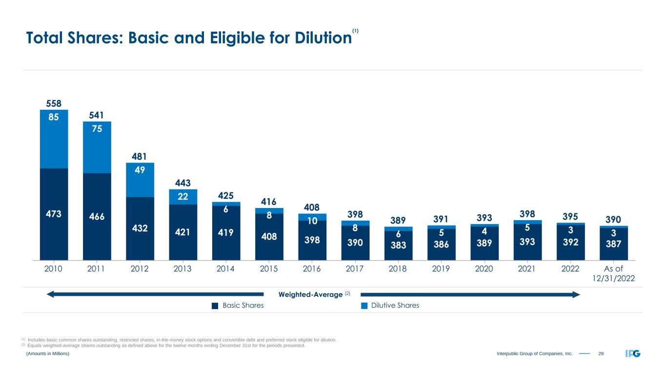 27Interpublic Group of Companies, Inc. Twelve Months Ended December 31, 2021 As Reported Amortization of Acquired Intangibles Restructuring Charges (2) Net Losses on Sales of Businesses (3) Loss on Early Extinguishment of Debt (4) Adjusted Results (Non-GAAP) Operating Income and Adjusted EBITA before Restructuring Charges (5) $ 1,436.2 $ (86.2) $ (10.6) $ 1,533.0 Total (Expenses) and Other Income (6) (214.1) $ (13.3) $ (74.0) (126.8) Income Before Income Taxes 1,222.1 (86.2) (10.6) (13.3) (74.0) 1,406.2 Provision for Income Taxes 251.8 16.9 3.2 2.0 18.5 292.4 Effective Tax Rate 20.6 % 20.8 % Equity in Net Income of Unconsolidated Affiliates 2.5 2.5 Net Income Attributable to Noncontrolling Interests (20.0) (20.0) Net Income Available to IPG Common Stockholders $ 952.8 $ (69.3) $ (7.4) $ (11.3) $ (55.5) $ 1,096.3 Weighted-Average Number of Common Shares Outstanding - Basic 393.0 393.0 Dilutive effect of stock options and restricted shares 5.4 5.4 Weighted-Average Number of Common Shares Outstanding - Diluted 398.4 398.4 Earnings per Share Available to IPG Common Stockholders (7) (8): Basic $ 2.42 $ (0.18) $ (0.02) $ (0.03) $ (0.14) $ 2.79 Diluted $ 2.39 $ (0.17) $ (0.02) $ (0.03) $ (0.14) $ 2.75 ($ in Millions, except per share amounts) (1) The table reconciles our reported results to our adjusted non-GAAP results. Management believes the resulting comparisons provide useful supplemental data that, while not a substitute for GAAP measures, allow for greater transparency in the review of our financial and operational performance. (2) Restructuring Charges of $10.6 in FY 2021 were related to adjustments to our restructuring actions taken in 2020, which were designed to reduce our operating expenses structurally and permanently relative to revenue and to accelerate the transformation of our business. (3) Includes losses on compete dispositions of businesses and the classification of certain assets as held for sale, partially offset by a non-cash in the third quarter of 2021 related to the deconsolidation of a previously consolidated subsidiary in which we maintain an equity interest. (4) Consists of a loss related to the early extinguishment of our 4.000% unsecured senior notes due 2022, 3.750% unsecured senior notes due 2023 and half of our 4.200% unsecured senior notes due 2024. (5) Refer to non-GAAP reconciliation of Adjusted EBITA before Restructuring Charges on slide 23. (6) Consists of non-operating expenses including interest expense, net and other expense, net. (7) Earnings per share basic and diluted per share, both as reported and adjusted results (Non-GAAP), include a positive impact of $0.15 related to the reversals of income tax valuation allowances. (8) Earnings per share amounts calculated on an unrounded basis. Reconciliation of Adjusted Results (1)
