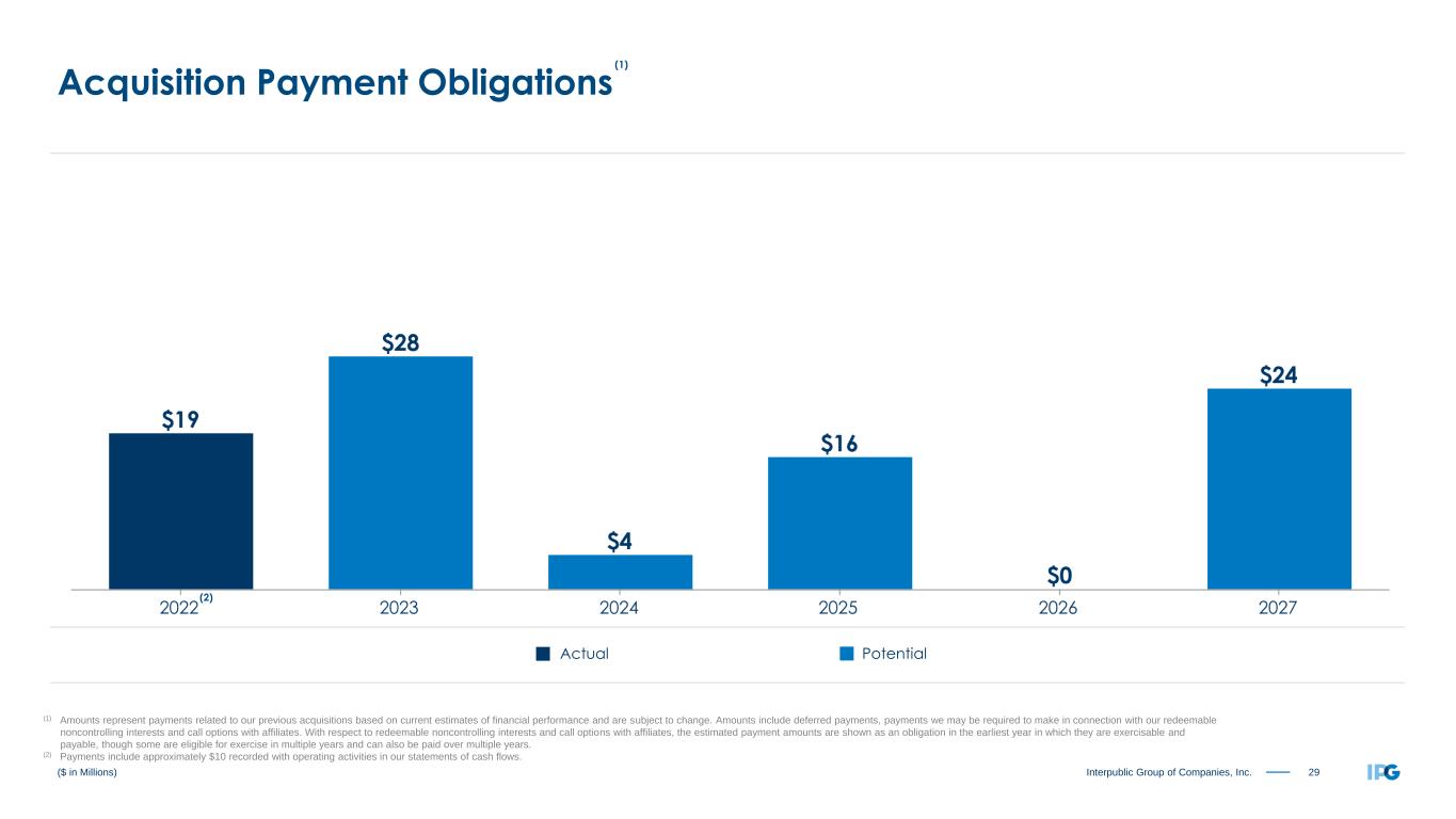29Interpublic Group of Companies, Inc. ($ in Millions) Acquisition Payment Obligations (1) Amounts represent payments related to our previous acquisitions based on current estimates of financial performance and are subject to change. Amounts include deferred payments, payments we may be required to make in connection with our redeemable noncontrolling interests and call options with affiliates. With respect to redeemable noncontrolling interests and call options with affiliates, the estimated payment amounts are shown as an obligation in the earliest year in which they are exercisable and payable, though some are eligible for exercise in multiple years and can also be paid over multiple years. (2) Payments include approximately $10 recorded with operating activities in our statements of cash flows. (2) PotentialActual (1)